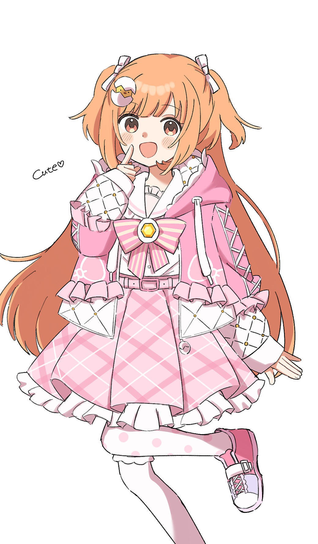 1girl asymmetrical_legwear belt blush_stickers bow bowtie drawstring egg_hair_ornament food-themed_hair_ornament foot_out_of_frame frilled_jacket frilled_sailor_collar frills gem hair_ornament hair_ribbon highres hood hooded_jacket jacket kirara_tamako kirara_tamako_(2nd_costume) knee_up konata1215 long_hair long_sleeves looking_at_viewer mismatched_legwear nijisanji open_clothes open_jacket open_mouth orange_eyes orange_hair petticoat pink_belt pink_bow pink_bowtie pink_jacket pink_shoes pink_skirt plaid_clothes plaid_skirt pleated_skirt polka_dot polka_dot_thighhighs puffy_long_sleeves puffy_sleeves ribbon sailor_collar shirt shoes simple_background skirt sleeves_past_wrists smile solo standing standing_on_one_leg striped_bow striped_bowtie striped_clothes thighhighs two-sided_fabric two-sided_jacket two_side_up virtual_youtuber white_background white_ribbon white_sailor_collar white_shirt white_thighhighs yellow_gem
