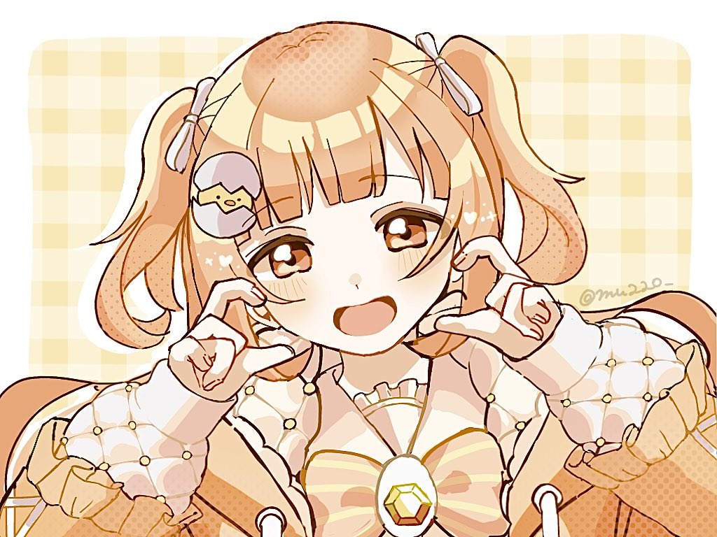 1girl blush border bow bowtie drawstring egg_hair_ornament food-themed_hair_ornament frilled_jacket frilled_sailor_collar frills gem hair_ornament hair_ribbon half-heart_hands hands_on_own_cheeks hands_on_own_face hood hooded_jacket jacket kirara_tamako kirara_tamako_(2nd_costume) long_hair long_sleeves looking_at_viewer mu220 nijisanji official_alternate_color open_clothes open_jacket open_mouth orange_bow orange_bowtie orange_eyes orange_hair orange_jacket outside_border plaid_background polka_dot portrait puffy_long_sleeves puffy_sleeves ribbon sailor_collar shirt sleeves_past_wrists smile solo striped_bow striped_bowtie striped_clothes twitter_username two-sided_fabric two-sided_jacket two_side_up virtual_youtuber white_border white_ribbon white_sailor_collar white_shirt yellow_background yellow_gem