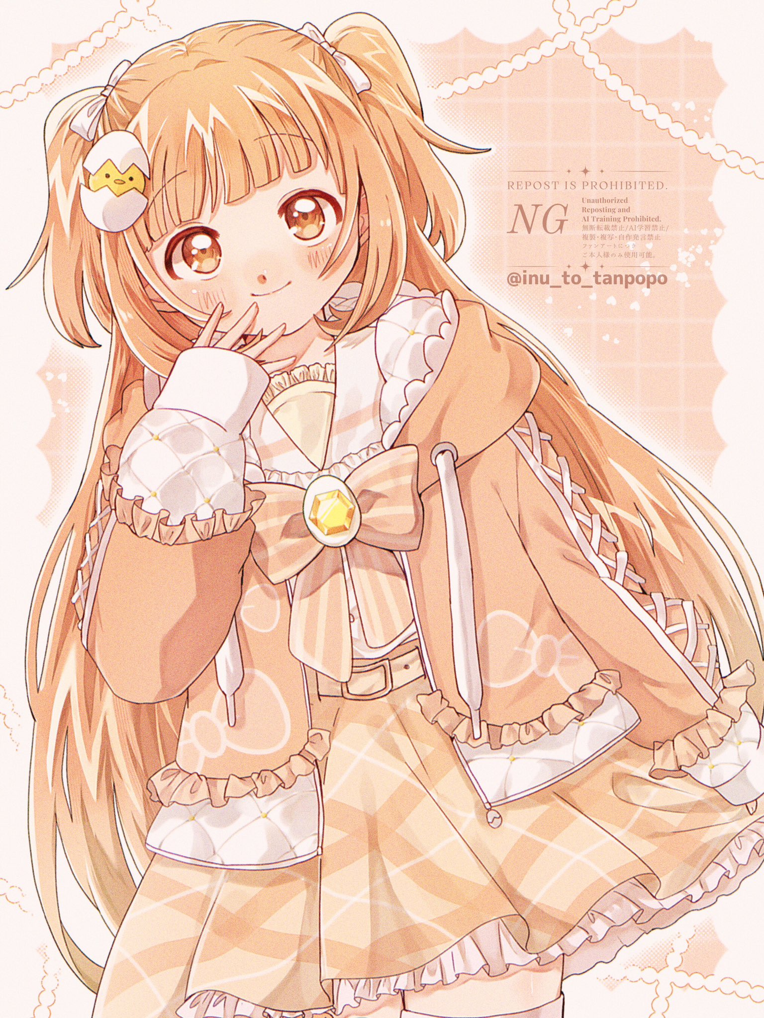 1girl belt blush border bow bowtie closed_mouth cowboy_shot drawstring dutch_angle egg_hair_ornament food-themed_hair_ornament frilled_jacket frilled_sailor_collar frills gem grid_background hair_ornament hair_ribbon hand_to_own_mouth highres hood hooded_jacket inu_to_tanpopo jacket kirara_tamako kirara_tamako_(2nd_costume) long_hair long_sleeves looking_at_viewer nijisanji official_alternate_color open_clothes open_jacket orange_background orange_belt orange_bow orange_bowtie orange_eyes orange_hair orange_jacket orange_skirt outline petticoat plaid_clothes plaid_skirt pleated_skirt puffy_long_sleeves puffy_sleeves ribbon sailor_collar shirt skirt sleeves_past_wrists smile solo standing striped_bow striped_bowtie striped_clothes thighhighs twitter_username two-sided_fabric two-sided_jacket two_side_up upturned_eyes variant_set virtual_youtuber watermark white_border white_outline white_ribbon white_sailor_collar white_shirt white_thighhighs yellow_gem