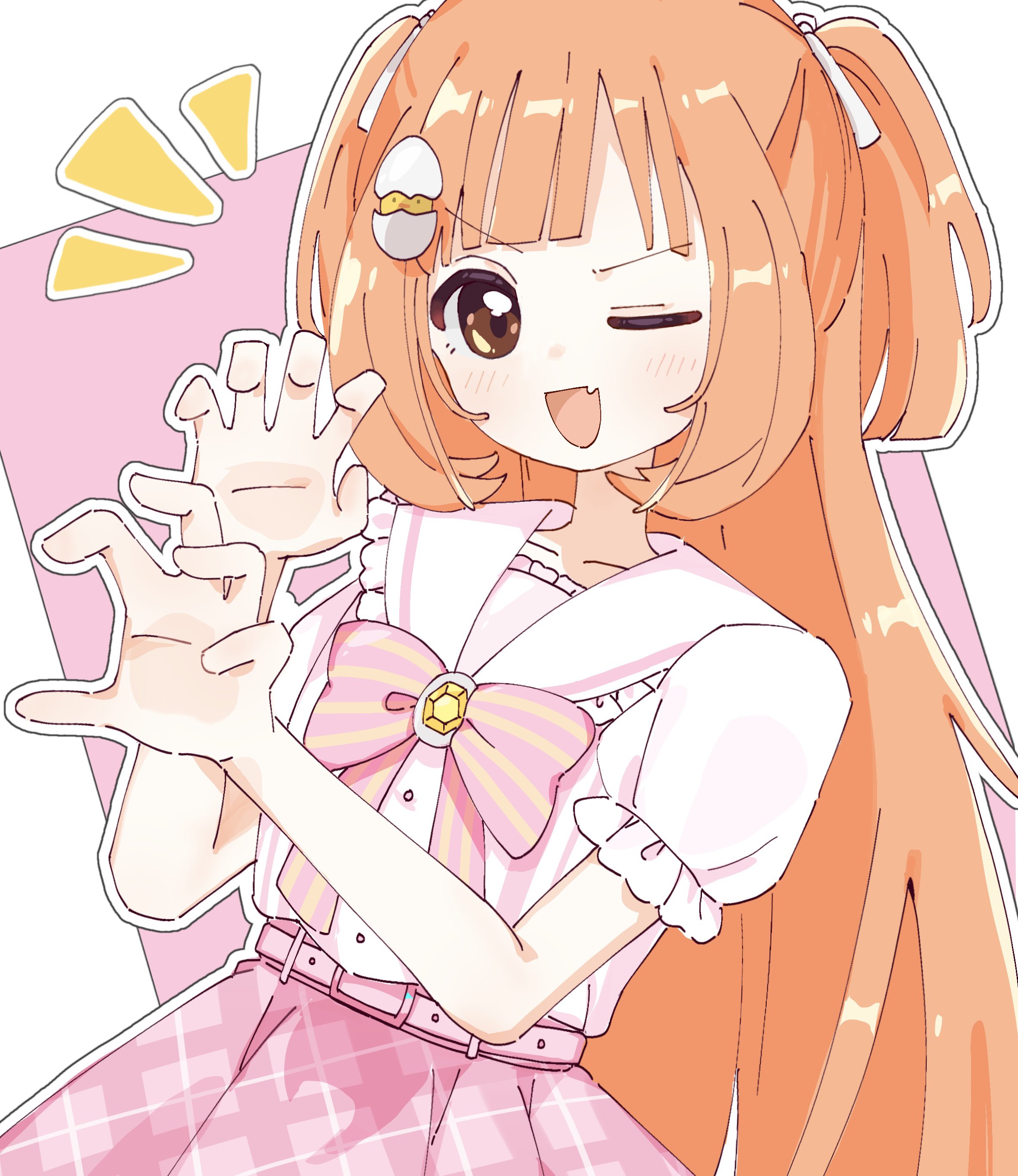 1girl ;d absurdres belt blush bow bowtie claw_pose cowboy_shot egg_hair_ornament fang food-themed_hair_ornament frilled_sailor_collar frilled_sleeves frills gem hair_ornament hair_ribbon highres kirara_tamako kirara_tamako_(2nd_costume) long_hair looking_at_viewer nijisanji no_jacket notice_lines one_eye_closed open_mouth orange_eyes orange_hair outline pink_background pink_belt pink_bow pink_bowtie pink_skirt plaid_clothes plaid_skirt pleated_skirt puffy_short_sleeves puffy_sleeves ribbon ryo_lo2 sailor_collar shirt shirt_tucked_in short_sleeves skin_fang skirt smile solo standing striped_bow striped_bowtie striped_clothes two_side_up v-shaped_eyebrows virtual_youtuber white_background white_outline white_ribbon white_sailor_collar white_shirt yellow_gem
