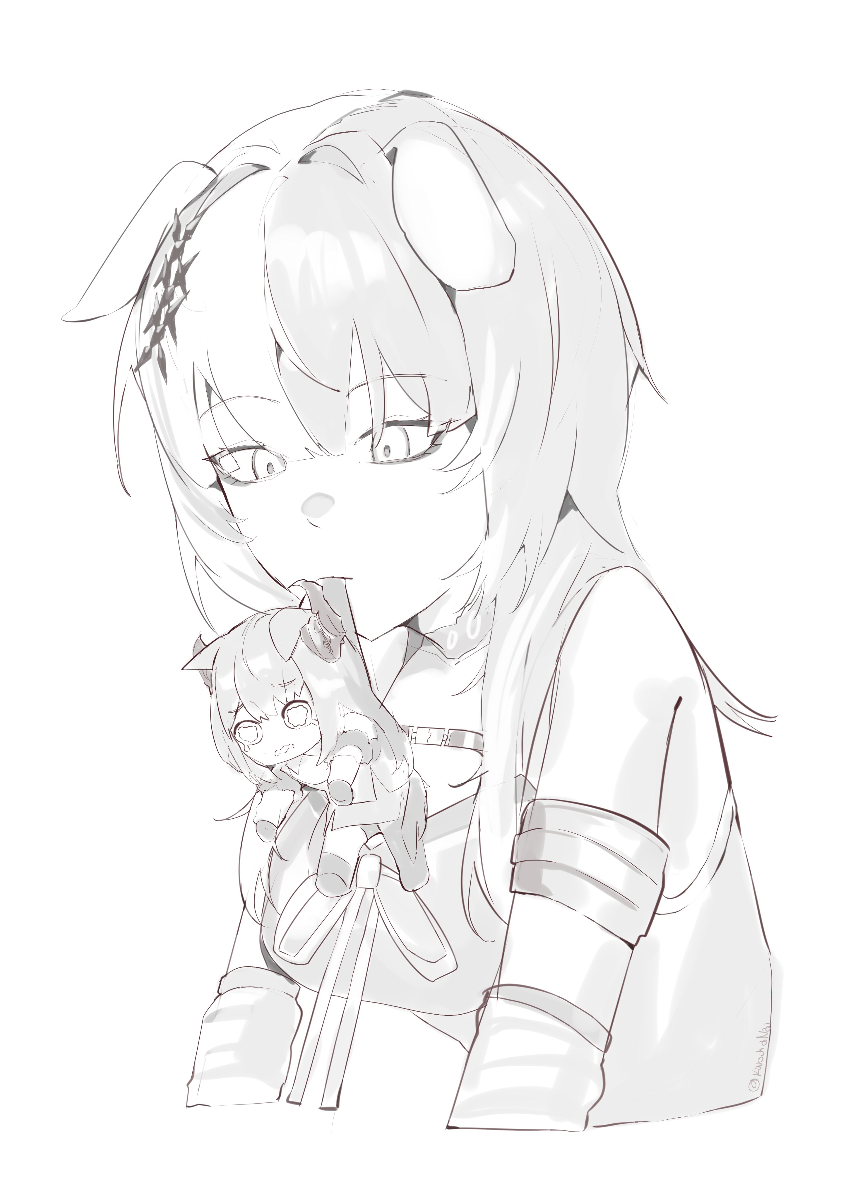 2girls absurdres animal_ears arm_strap dog_ears dog_girl dress greyscale highres hololive hololive_english kurochanai long_hair mini_person minigirl monochrome mouth_hold multiple_girls nerissa_ravencroft ribbon shiori_novella shiori_novella_(1st_costume) virtual_youtuber