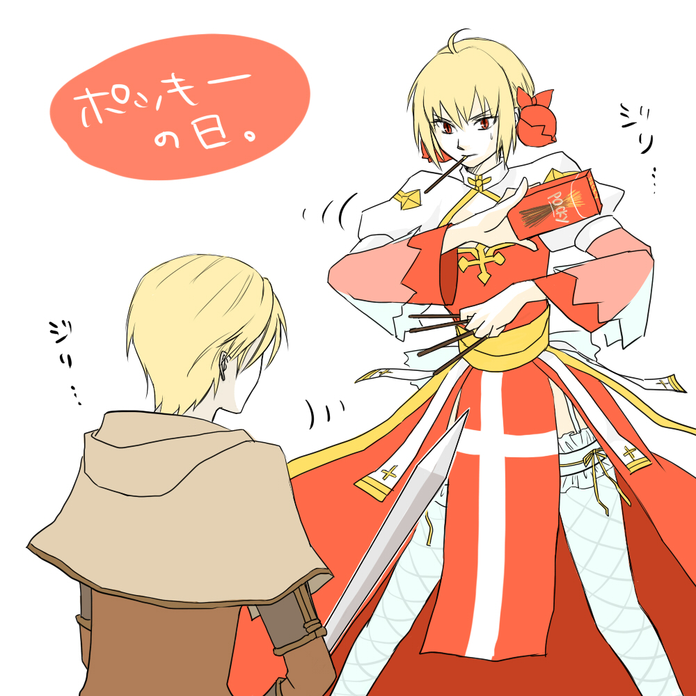 1boy 1girl arch_bishop_(ragnarok_online) between_fingers blonde_hair brown_capelet brown_shirt capelet cleavage_cutout clothing_cutout commentary_request cross cross_print doppelganger_(ragnarok_online) dress feet_out_of_frame fishnet_thighhighs fishnets food food_in_mouth frilled_thighhighs frills garter_straps holding holding_sword holding_weapon juliet_sleeves long_sleeves looking_at_another make_adog pelvic_curtain pocky pocky_day pocky_in_mouth puffy_sleeves ragnarok_online red_dress red_eyes sash shirt short_hair simple_background sword thighhighs translation_request two-tone_dress weapon white_background white_dress white_thighhighs yellow_sash