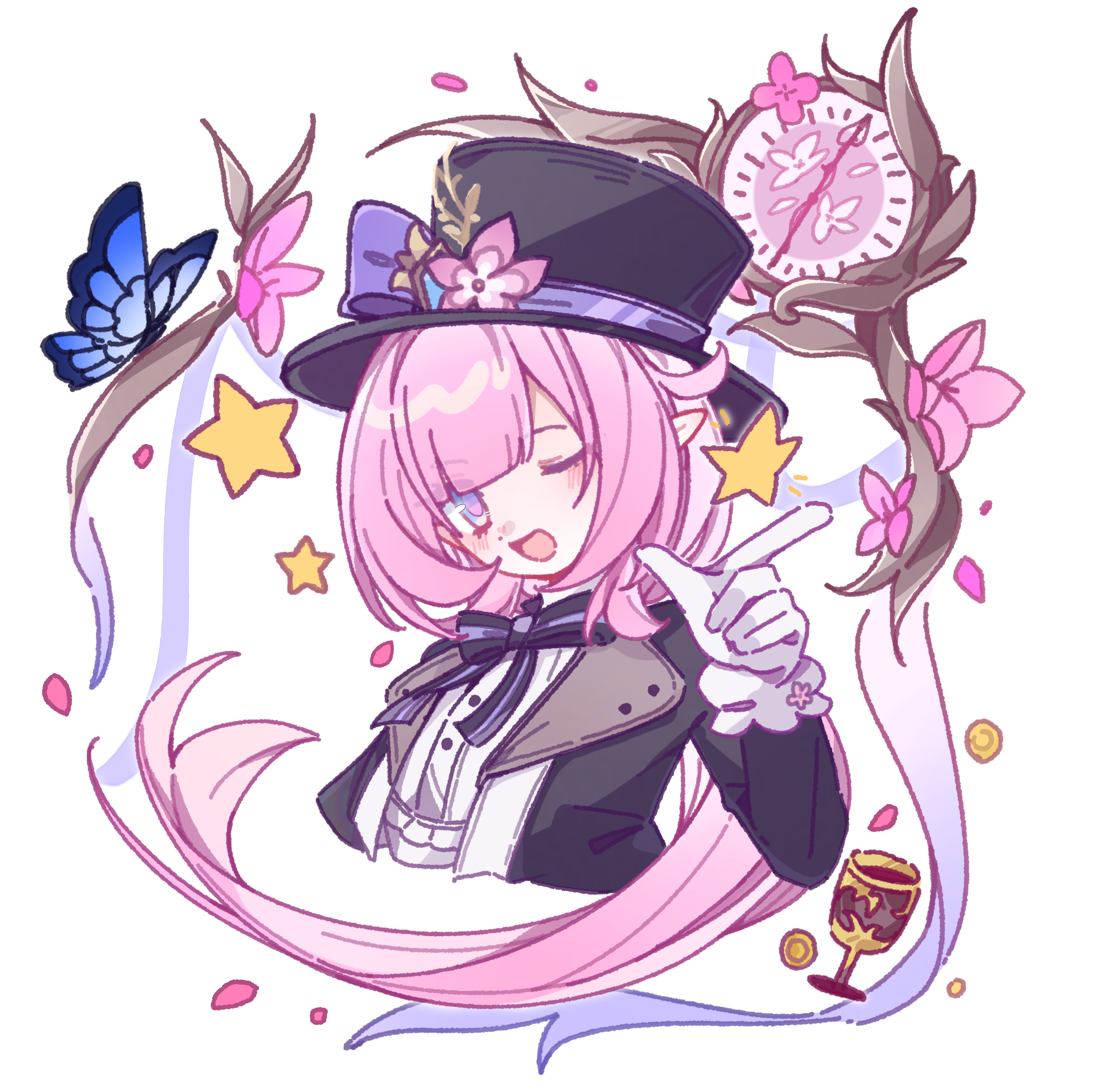 1girl ;o absurdres black_coat black_ribbon blue_eyes breasts bug butterfly clock coat cropped_torso cup elf elysia_(honkai_impact) gloves hat highres honkai_(series) honkai_impact_3rd insect long_hair looking_at_viewer medium_breasts one_eye_closed pink_hair pointy_ears purple_eyes ribbon shirt simple_background solo textless_version top_hat very_long_hair white_background white_gloves white_shirt yinanhuahua