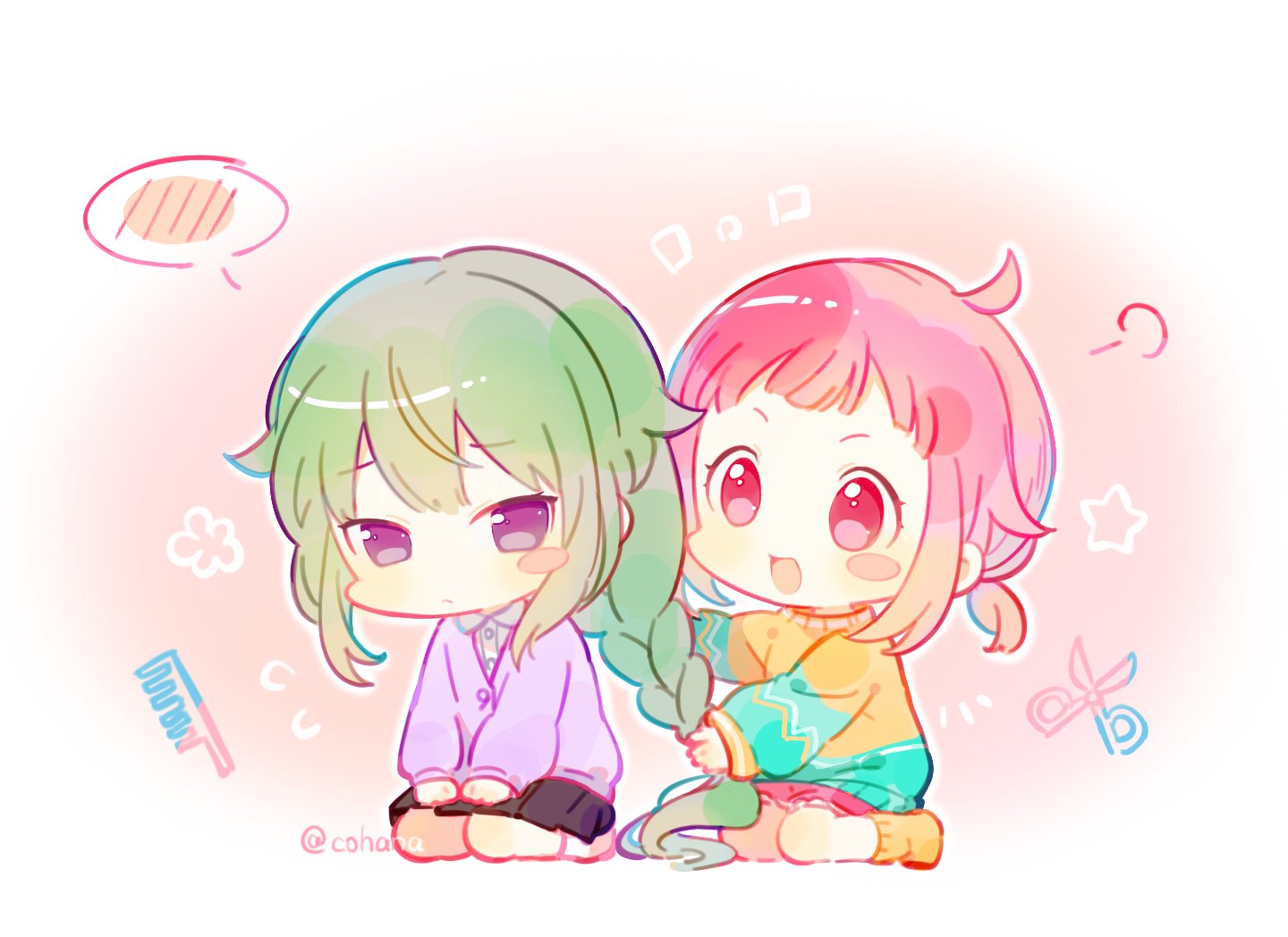 2girls :d adjusting_another's_hair ahoge alternate_hairstyle ankle_socks aqua_sweater atashi-tachi_no_happy_end_(project_sekai) black_skirt blush_stickers border braid braided_ponytail buttons cardigan center-flap_bangs chibi chibi_only child closed_mouth cohana collared_shirt comb double-parted_bangs flying_sweatdrops frilled_shorts frills frown full_body green_hair hair_flaps kusanagi_nene long_hair long_sleeves looking_at_another low_ponytail miniskirt multiple_girls no_pupils no_shoes ootori_emu open_mouth orange_socks orange_sweater outline outside_border pink_background pink_eyes pink_hair pink_shorts pleated_skirt ponytail project_sekai puffy_long_sleeves puffy_sleeves purple_cardigan purple_eyes raised_inner_eyebrows round_border scissors shirt short_bangs short_hair short_ponytail short_shorts shorts simple_background single_blush_sticker single_braid sitting skirt smile socks spoken_blush star_(symbol) sweater tareme tongue tsurime two-tone_sweater v_arms very_long_hair white_border white_outline white_shirt white_socks