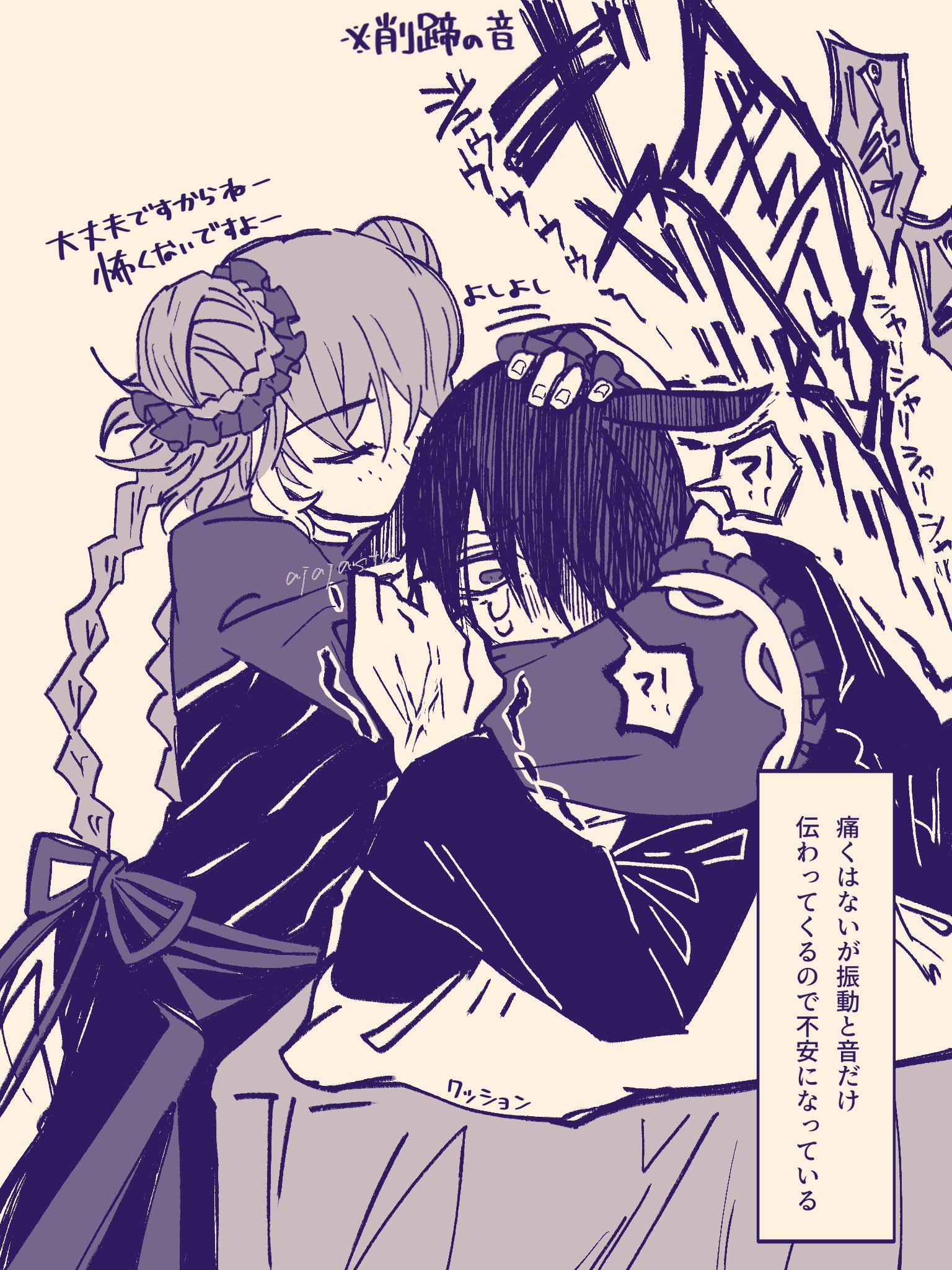 !? 1boy 1girl ajajasta bed braid closed_eyes double_bun dress hongyuan_(identity)_(project_moon) freckles frilled_sleeves frills hair_bun heishou_pack-wu_branch_(identity)_(project_moon) highres hugging_object ishmael_(project_moon) limbus_company long_hair low_twin_braids multicolored_hair pillow pillow_hug project_moon side_slit streaked_hair translation_request twin_braids very_long_hair yi_sang_(project_moon)