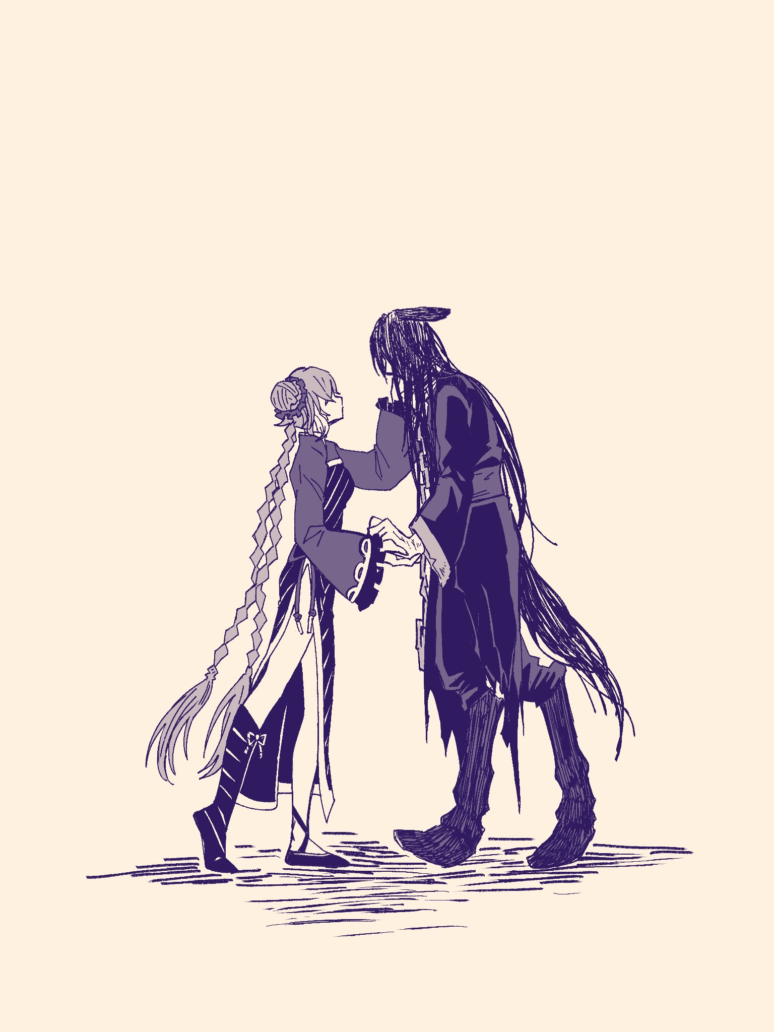 1boy 1girl ajajasta animal_ears animal_legs blue_theme braid chinese_clothes hongyuan_(identity)_(project_moon) full_body hand_on_another's_face heishou_pack-wu_branch_(identity)_(project_moon) highres holding_hands horse_boy horse_ears horse_legs horse_tail ishmael_(project_moon) limbus_company long_hair low_twin_braids monochrome project_moon shoes shrug_(clothing) side_slit sitting standing tail twin_braids very_long_hair yi_sang_(project_moon)