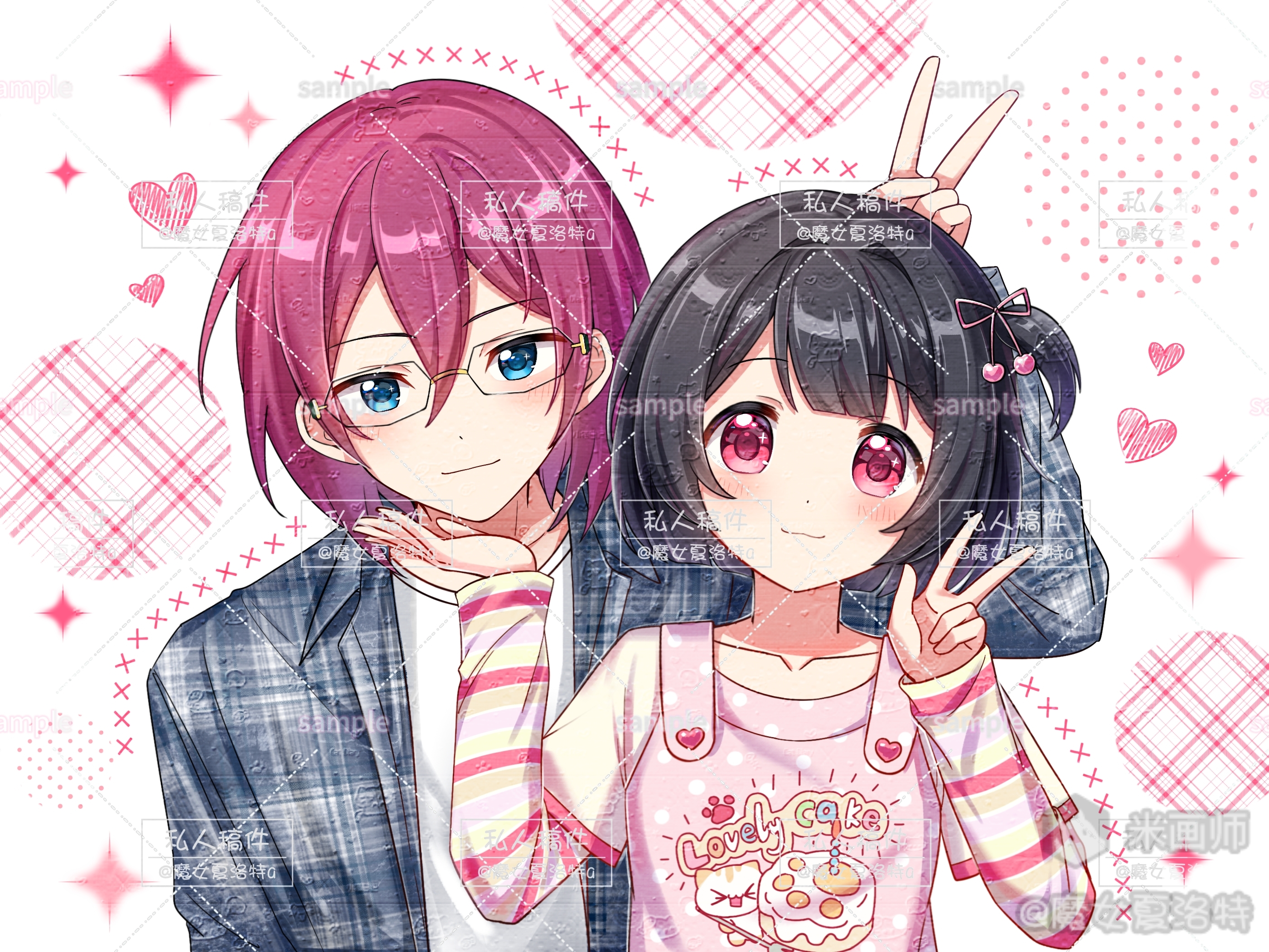 1boy 1girl :3 arm_up black-framed_eyewear black_hair black_jacket blue_eyes blush closed_mouth double-parted_bangs glasses hair_between_eyes hands_up highres jacket long_sleeves looking_at_viewer mihuashi_username monu_xialuote open_clothes open_jacket original pink_shirt red_eyes red_hair shirt short_hair smile striped_sleeves upper_body v w watermark watermark_grid white_shirt