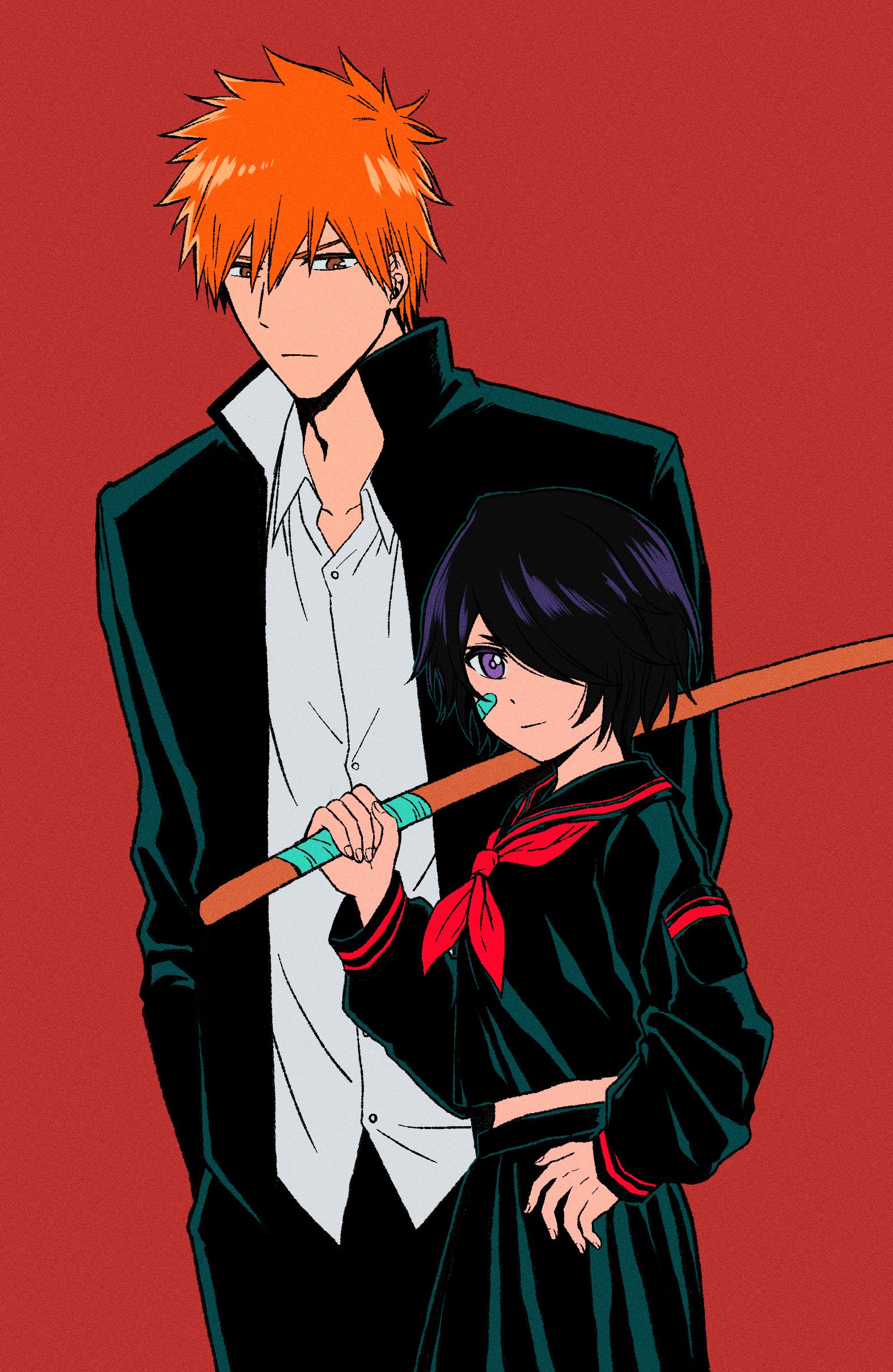1boy 1girl absurdres black_hair black_jacket black_pants black_serafuku black_shirt black_skirt bleach bleach:_the_high_school_warfare breasts cowboy_shot delinquent gakuran hair_between_eyes hair_over_one_eye hands_in_pockets highres jacket kuchiki_rukia kurosaki_ichigo medium_breasts midriff neckerchief official_alternate_costume orange_eyes orange_hair over_shoulder pants purple_eyes red_background red_neckerchief school_uniform serafuku shirt short_hair skirt star_(zhongyan88528) weapon weapon_over_shoulder white_shirt