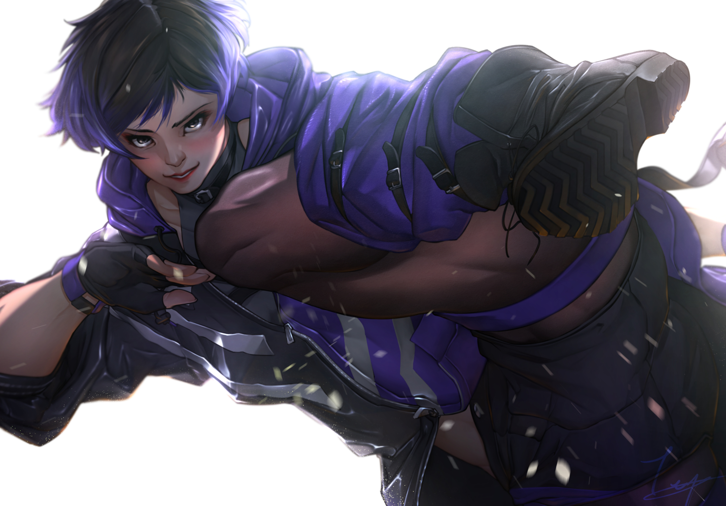 1girl black_gloves black_hair black_shoes black_shorts brown_pantyhose cropped fighting_stance fingerless_gloves gloves gradient_hair highres jacket leg_lift leg_warmers looking_at_viewer multicolored_hair pantyhose parted_lips purple_hair purple_jacket purple_leg_warmers reina_(tekken) shoes short_shorts shorts simple_background smile solo tekken teppu_tora two-tone_hair white_background