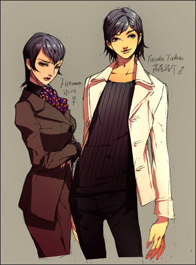 1boy 1girl black_hair black_shirt brown_background crossed_arms formal_clothes genderswap genderswap_(ftm) genderswap_(mtf) hikawa_(megami_tensei) jacket lipstick makeup mars_symbol open_clothes open_jacket purple_scarf scarf shaliva shin_megami_tensei shin_megami_tensei_iii:_nocturne shirt short_hair sideburns takao_yuko venus_symbol white_jacket