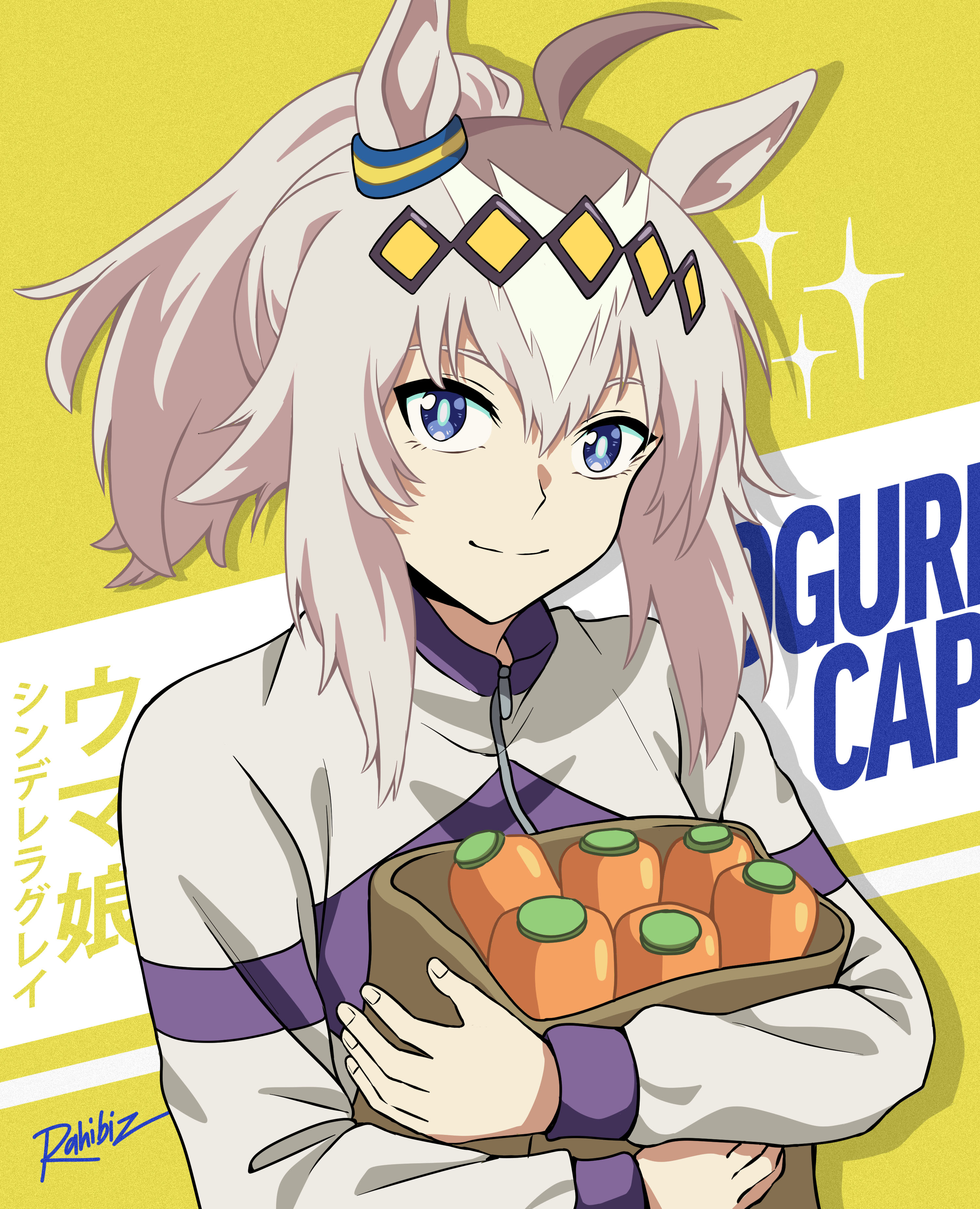 1girl absurdres ahoge animal_ears bag blue_eyes carrot closed_mouth ear_ornament grey_hair hair_between_eyes hair_ornament hairband highres holding holding_bag horse_ears horse_girl jacket kasamatsu_tracen_training_uniform long_hair long_sleeves looking_at_viewer multicolored_hair multicolored_jacket oguri_cap_(umamusume) ponytail purple_jacket rahibizzz smile solo track_jacket two-tone_jacket umamusume umamusume:_cinderella_gray upper_body
