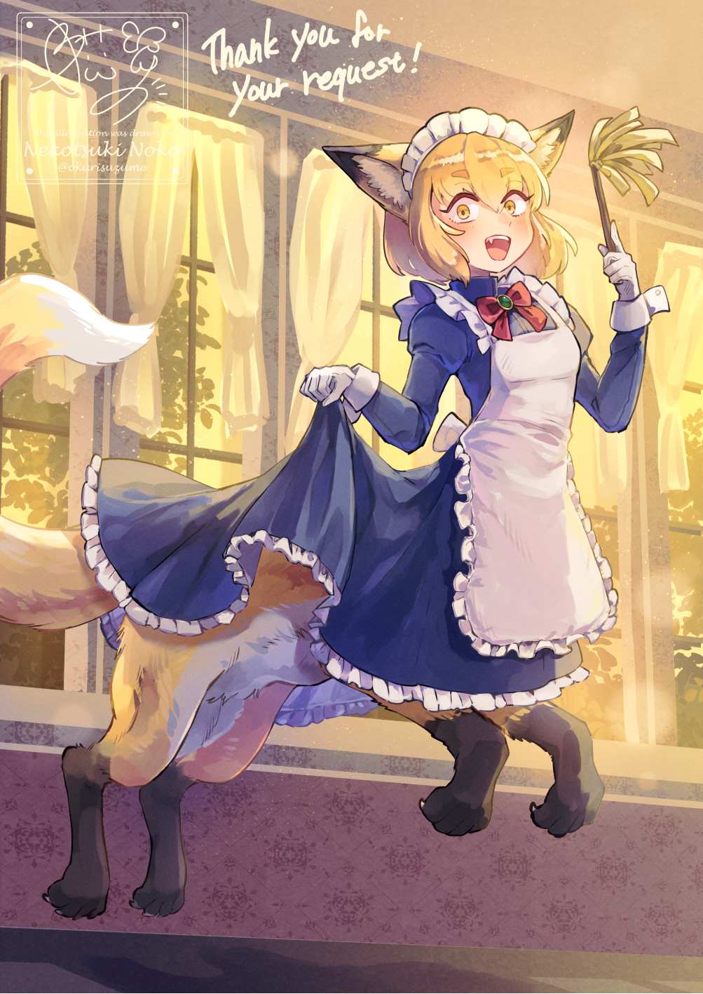1girl :d animal_ears apron blue_dress borrowed_character bow bowtie breasts centauroid claws clothes_lift commentary_request commission dress dress_lift duster fang floating fox_ears fox_girl fox_tail frilled_apron frills full_body gloves gosu_mei_(sakifox) hair_between_eyes highres holding holding_duster indoors jumping long_dress long_sleeves looking_at_viewer maid maid_apron maid_headdress medium_hair monster_girl monsterification nekotsuki_noko open_mouth orange_eyes orange_hair original puffy_long_sleeves puffy_sleeves red_bow red_bowtie sanpaku shadow sidelocks signature skeb_commission small_breasts smile solo tail taur teeth upper_teeth_only variant_set watermark white_apron white_gloves window