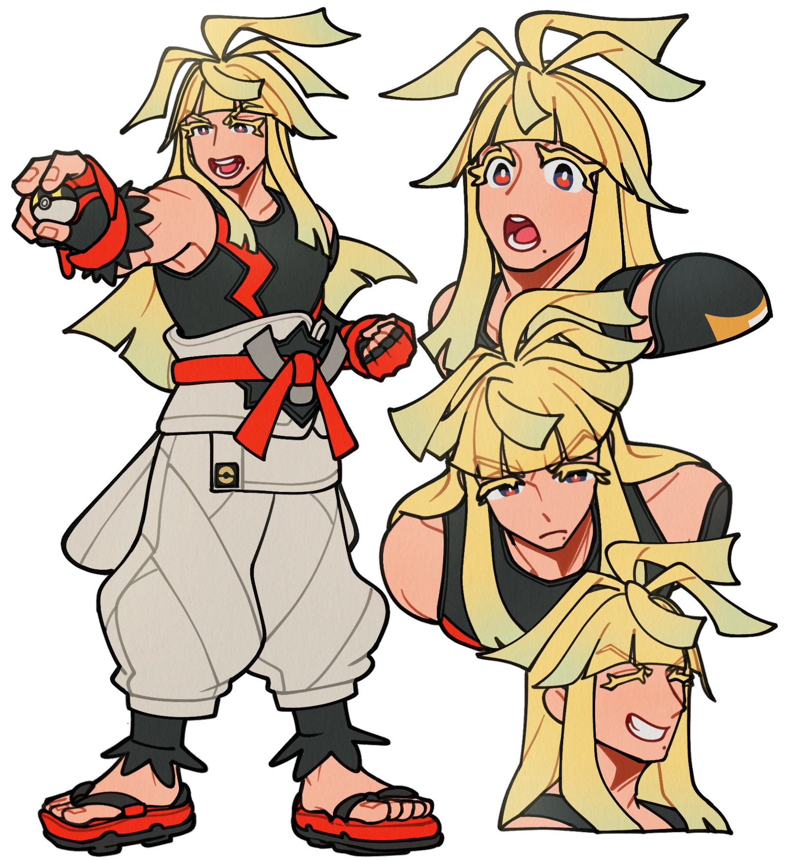1boy :o black_gloves black_shirt blonde_hair clenched_hand closed_eyes closed_mouth dd_is fingerless_gloves gloves highres holding holding_poke_ball ivor_(pokemon) long_hair male_focus mole mole_under_mouth multiple_views nintendo open_mouth pants poke_ball pokemon pokemon_legends:_z-a red_eyes sandals shirt sleeveless sleeveless_shirt ultra_ball white_background