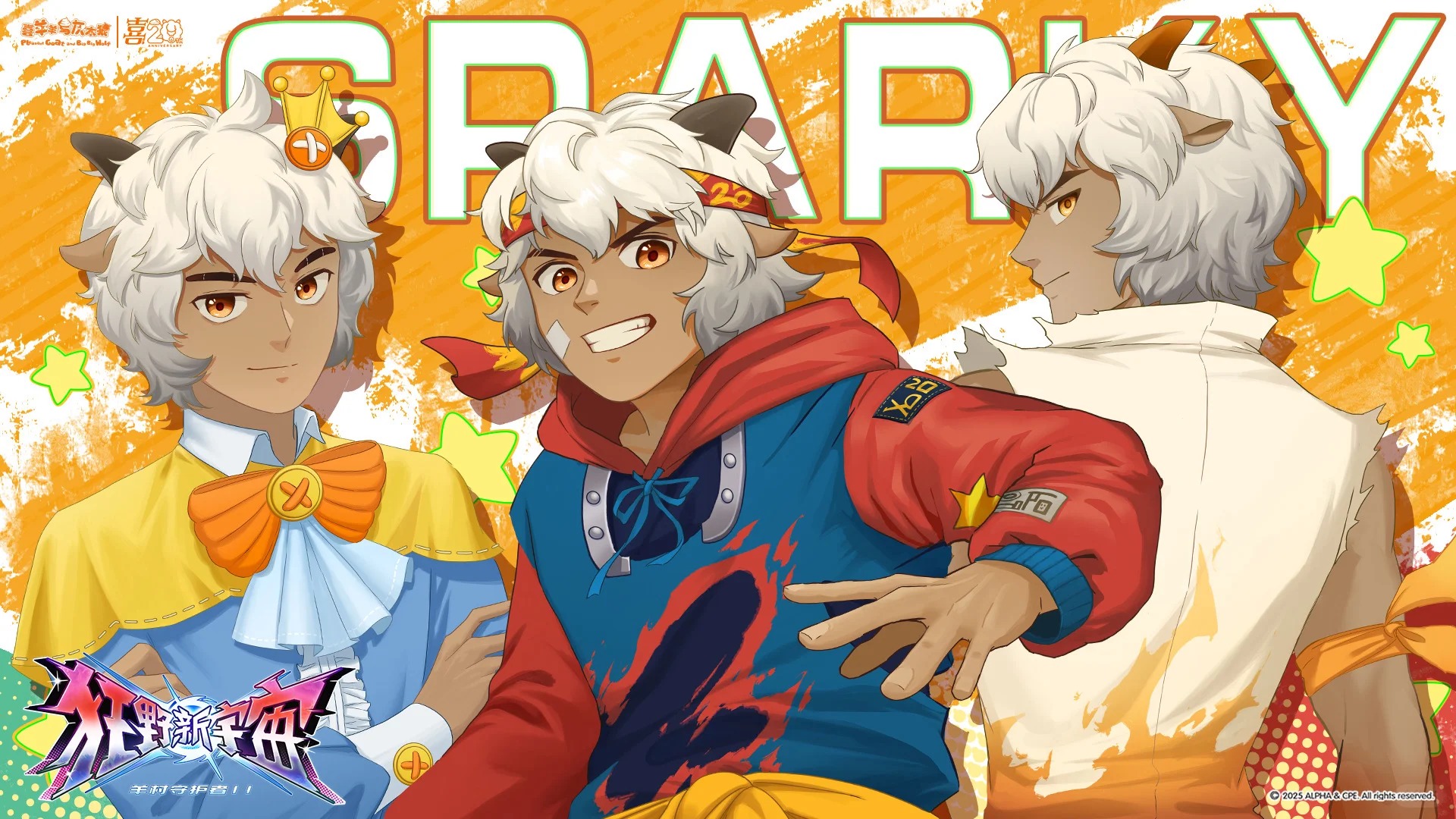 3boys animal_ears blue_shirt bow bowtie capelet closed_mouth clothes_around_waist crossed_arms dark-skinned_male dark_skin fei_yangyang flame_print gradient_hair grey_hair headband highres hood hoodie horns humanization long_sleeves male_focus multicolored_hair multicolored_headband multicolored_hoodie multiple_boys official_art orange_background orange_bow orange_bowtie orange_eyes red_headband red_hoodie sheep_ears sheep_horns shirt short_hair short_sleeves simple_background smile teeth white_hair white_shirt xiyangyang_yu_huitailang yellow_capelet