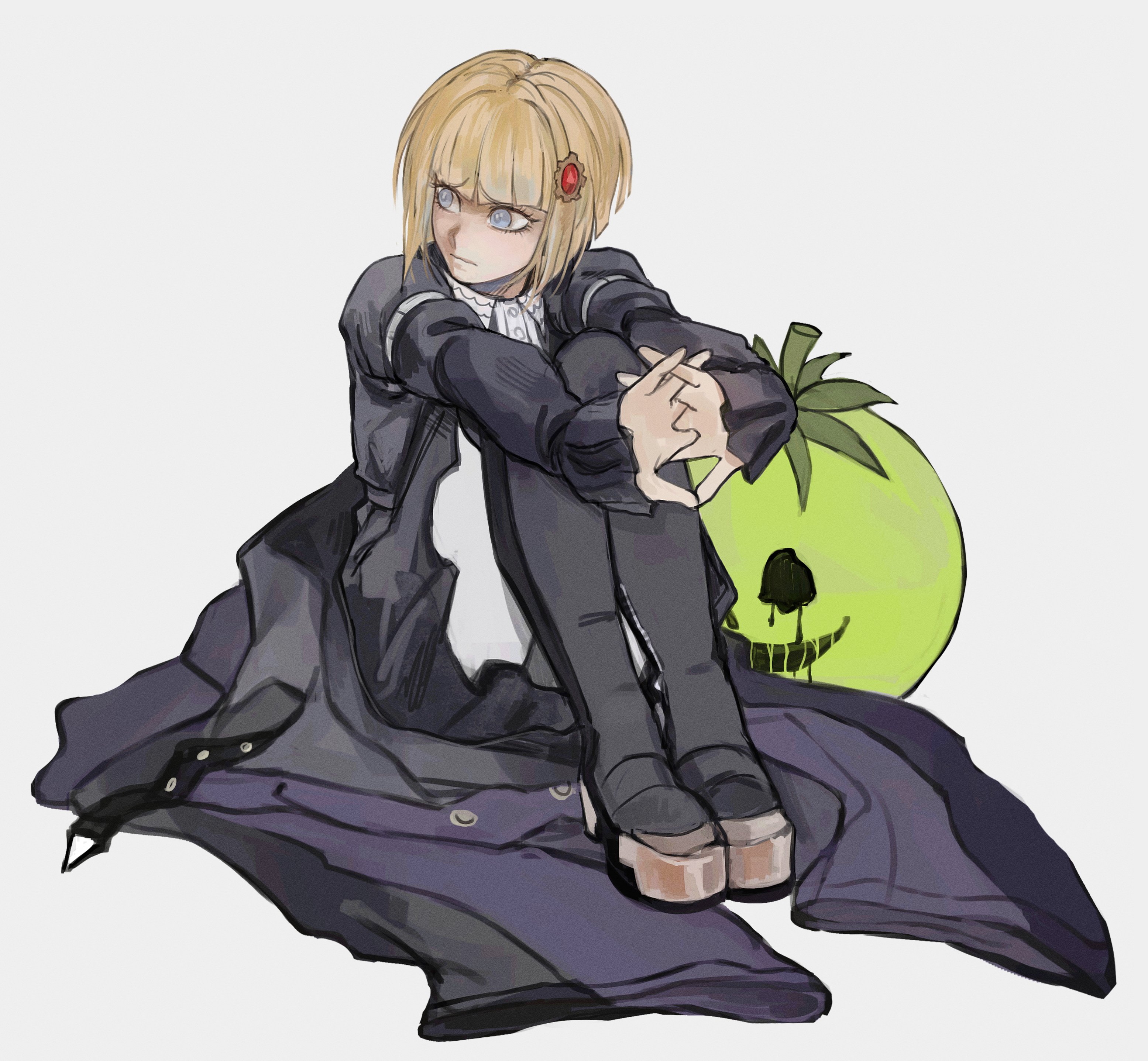 1girl absurdres anaizzzen black_coat black_dress blonde_hair blue_eyes bright_pupils coat commentary commentary_request dress english_commentary gem gem_hair_ornament hair_ornament highres interlocked_fingers knees_up looking_to_the_side mask oosuzuki_kurara own_hands_together red_gem short_hair simple_background sitting solo the_hundred_line_-last_defense_academy- unworn_coat unworn_mask white_background white_pupils