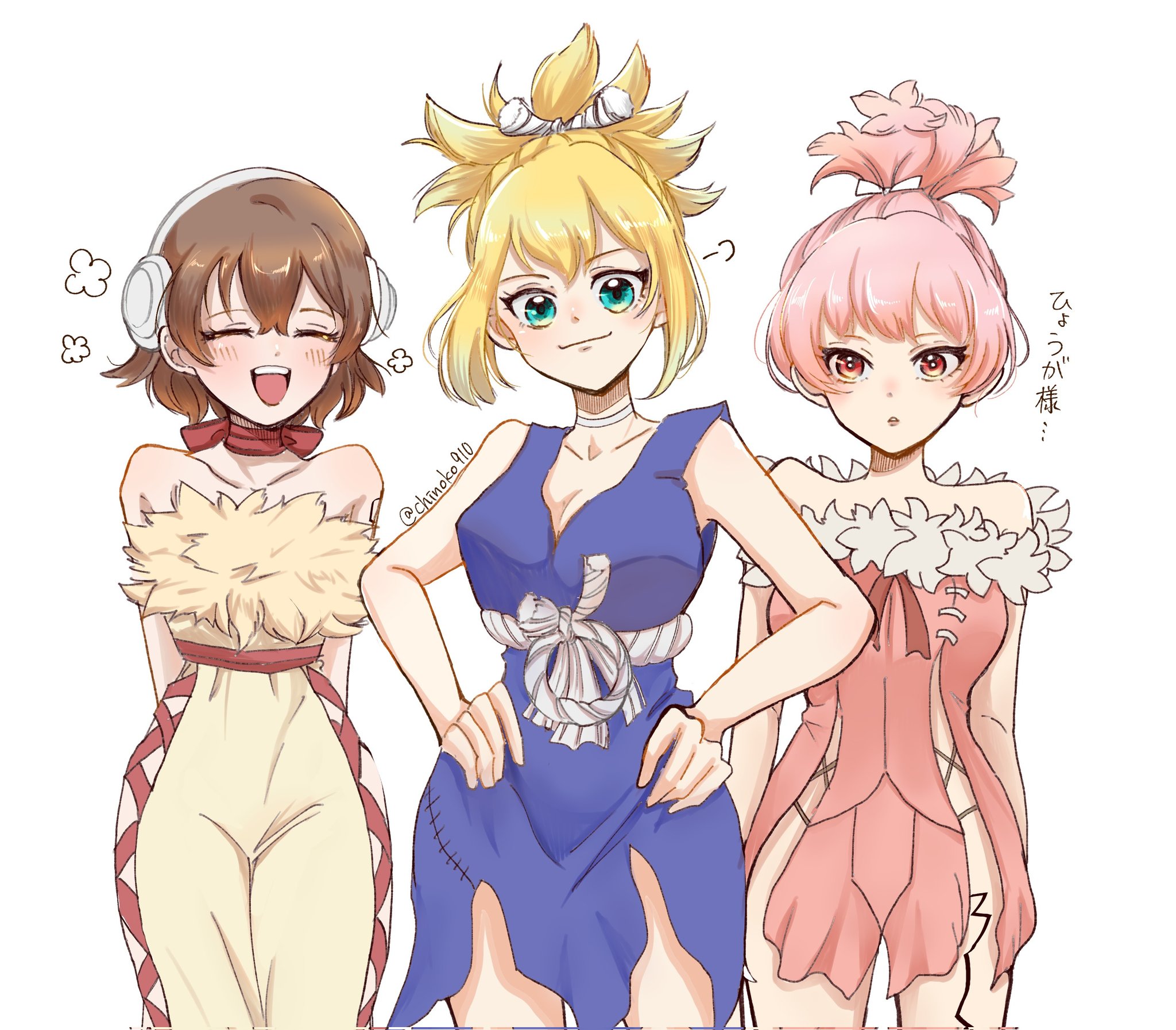 3girls bare_shoulders blonde_hair blue_dress blush breasts brown_hair chinoko910 choker cleavage closed_eyes closed_mouth clothing_cutout cosplay dr._stone dress green_eyes hands_on_own_hips headphones high_ponytail highres hip_vent kohaku_(dr._stone) looking_at_viewer momiji_homura multiple_girls ninja ogawa_yuzuriha open_mouth pink_dress pink_hair ponytail red_eyes rope rope_belt short_hair smile white_background white_choker
