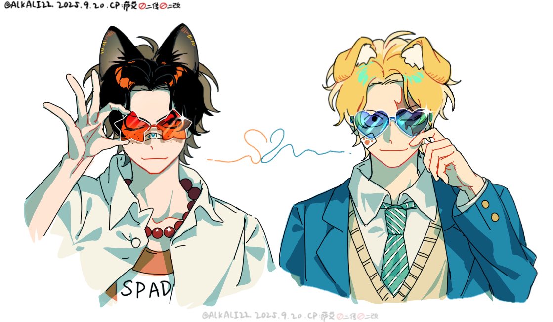 2boys animal_ears aqua_necktie bandaid bandaid_on_cheek bandaid_on_face bead_necklace beads black_hair blonde_hair blue-tinted_eyewear blue_jacket cat_ears collared_shirt commentary dated dog_ears heart heart-shaped_eyewear jacket jewelry looking_at_viewer male_focus multiple_boys necklace necktie one_piece open_clothes open_jacket open_shirt orange_tank_top portgas_d._ace red-tinted_eyewear sa_alkali22 sabo_(one_piece) shirt short_hair simple_background straight-on sunglasses sweater_vest untranslatable_commentary tank_top tinted_eyewear twitter_username upper_body white_background white_shirt