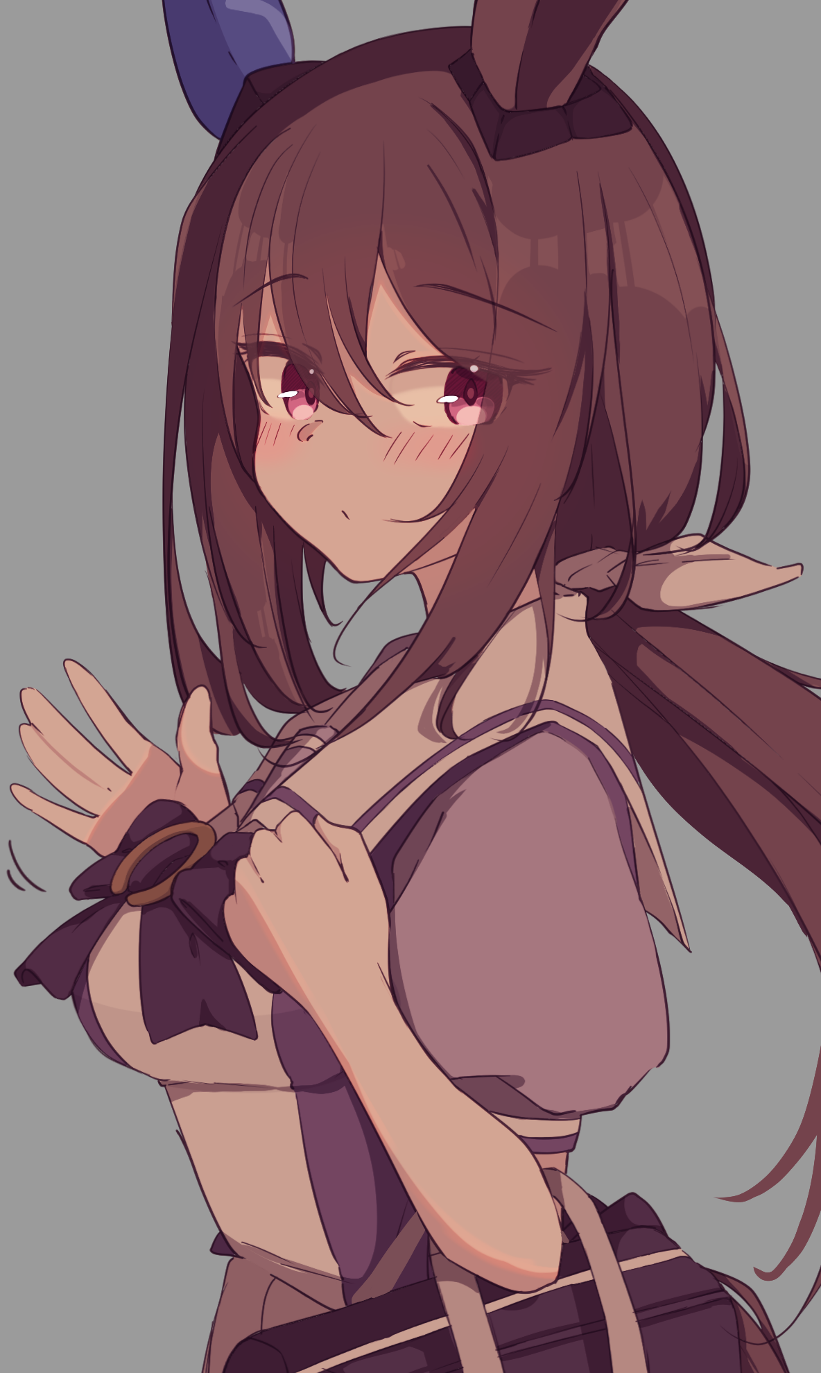 1girl admire_vega_(umamusume) animal_ears bag blush bow bowtie breasts brown_hair closed_mouth ear_covers ear_ornament hair_between_eyes highres horse_ears horse_girl horse_tail large_breasts long_hair looking_at_viewer low_ponytail mountain_yasan ponytail puffy_short_sleeves puffy_sleeves purple_bow purple_bowtie purple_eyes purple_serafuku purple_shirt sailor_collar school_bag school_uniform serafuku shirt short_sleeves simple_background single_ear_cover skirt solo tail tracen_school_uniform umamusume waving white_sailor_collar white_skirt