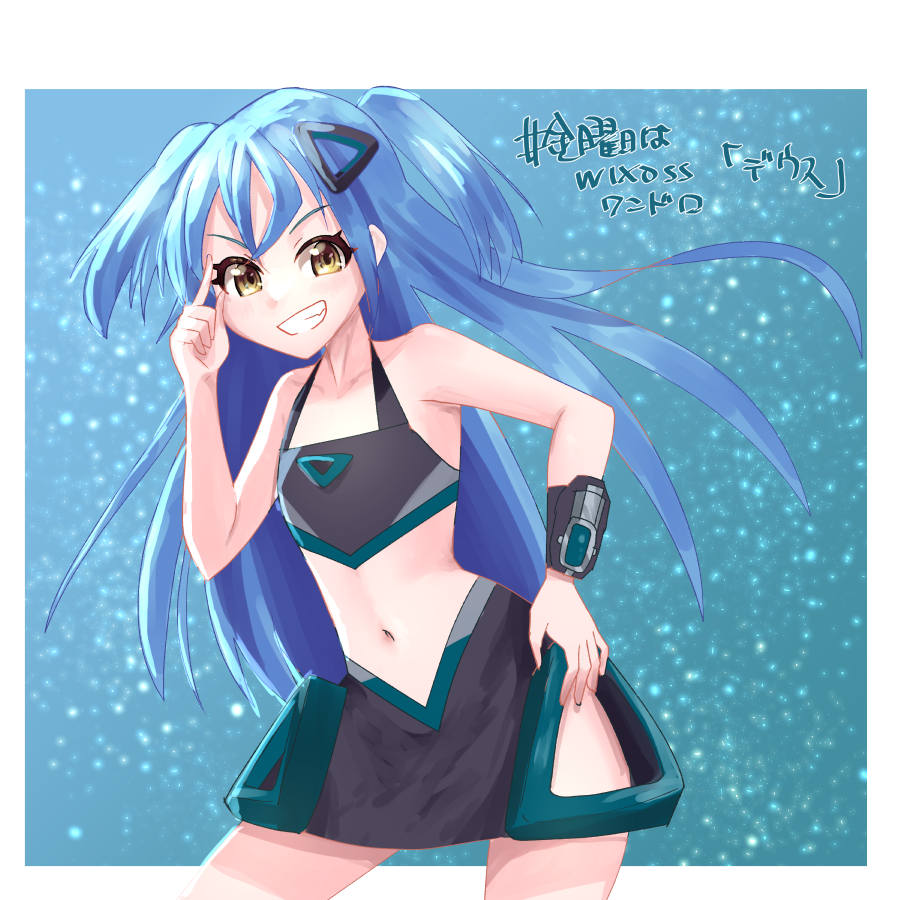 1girl black_shirt black_shorts blue_hair border closed_mouth clothing_cutout hip_vent long_hair looking_at_viewer moepi_(itsuka05) shirt shorts smile solo two_side_up usuki_daina very_long_hair white_border wixoss yellow_eyes
