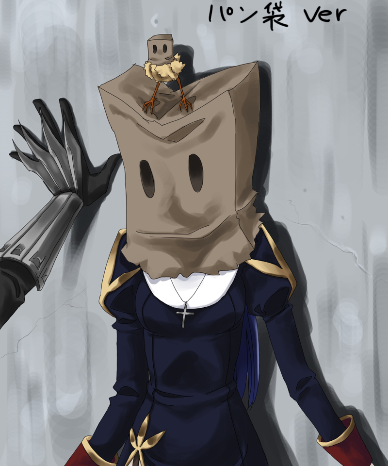 1boy 1girl animal animal_on_head assassin_cross_(ragnarok_online) baby_animal bag bag_on_head bird bird_on_head black_gloves blue_dress chick commentary_request cross cross_necklace dress gloves jewelry juliet_sleeves kabedon long_sleeves looking_at_viewer necklace on_head paper_bag pov pov_hands priest_(ragnarok_online) puffy_sleeves ragnarok_online solo_focus toriria upper_body vambraces