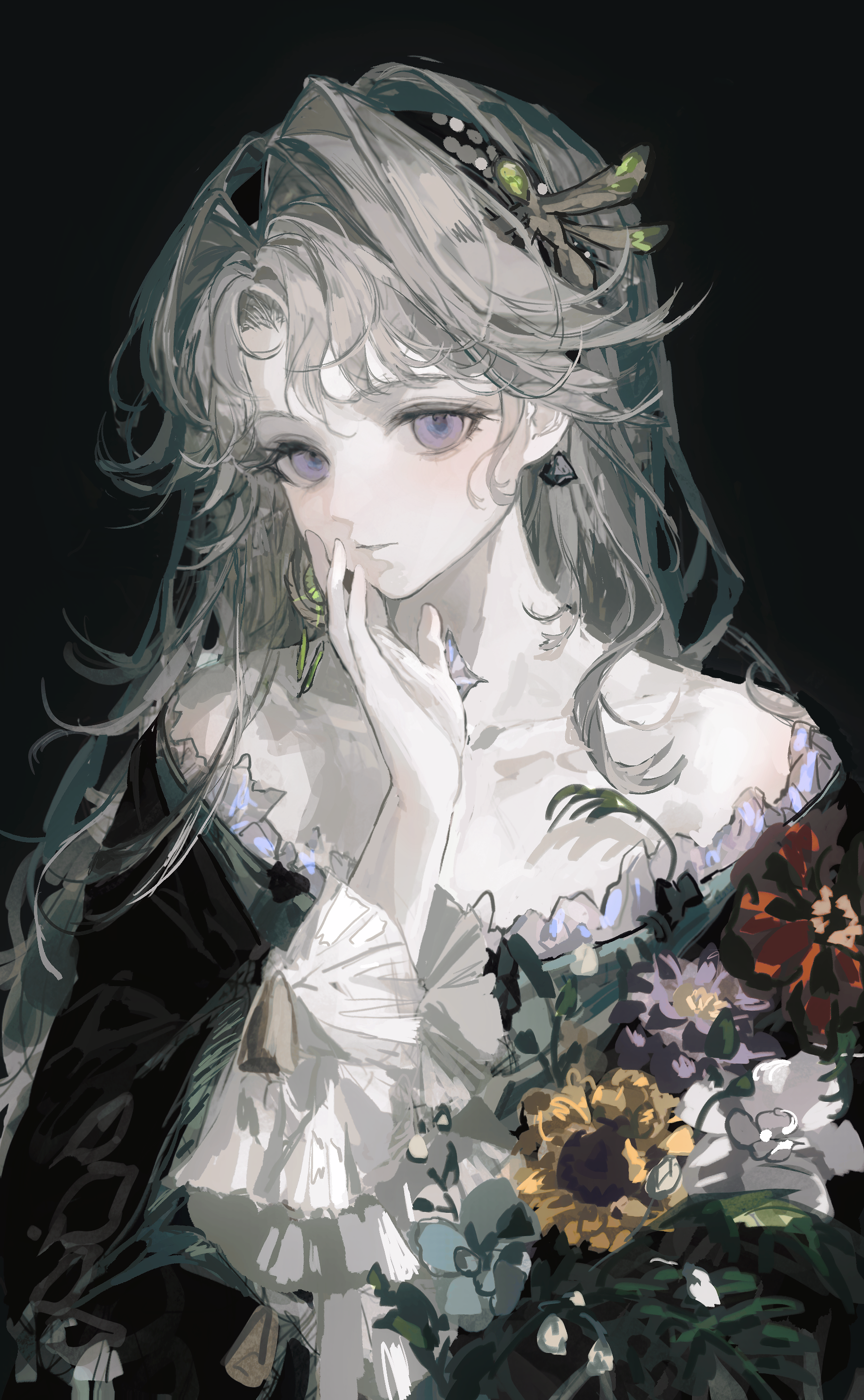 1girl absurdres bare_shoulders beryl_bouanich black_cloak blue_background chuanchuan_suuuu cloak crescent crescent_earrings crystal_earrings dragonfly_hair_ornament earrings floating_earrings flower grey_hair hand_on_own_cheek hand_on_own_face hand_up highres jewelry long_hair mismatched_earrings purple_eyes red_flower reverse:1999 solo upper_body white_flower yellow_flower