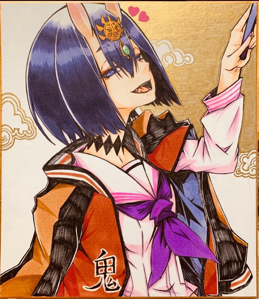 1girl asagirimao fate/grand_order fate_(series) headpiece horns jacket jacket_on_shoulders looking_at_viewer marker_(medium) oni open_mouth purple_eyes purple_hair school_uniform serafuku shikishi short_hair shuten_douji_(fate) shuten_douji_(sukeban)_(fate) skin-covered_horns smile solo traditional_media upper_body