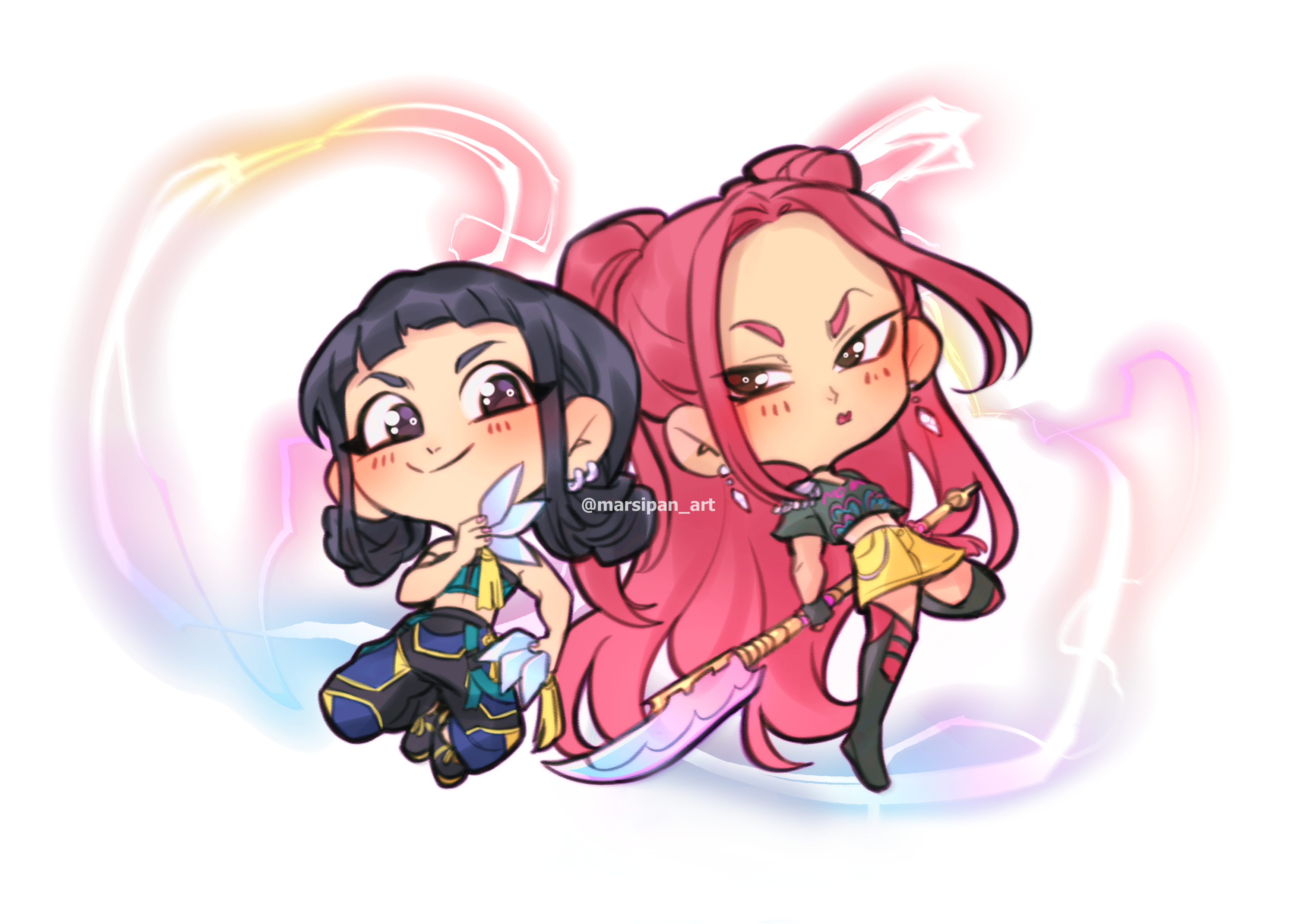 2girls absurdres black_hair blush brown_eyes chibi commentary double_bun earrings full_body hair_bun highres holding holding_polearm holding_weapon jewelry kpop_demon_hunters marsipan_art mira_(kpop_demon_hunters) multiple_girls pants pink_hair polearm short_bangs short_eyebrows sidelocks skirt smile twintails twitter_username weapon yellow_skirt zoey_(kpop_demon_hunters)
