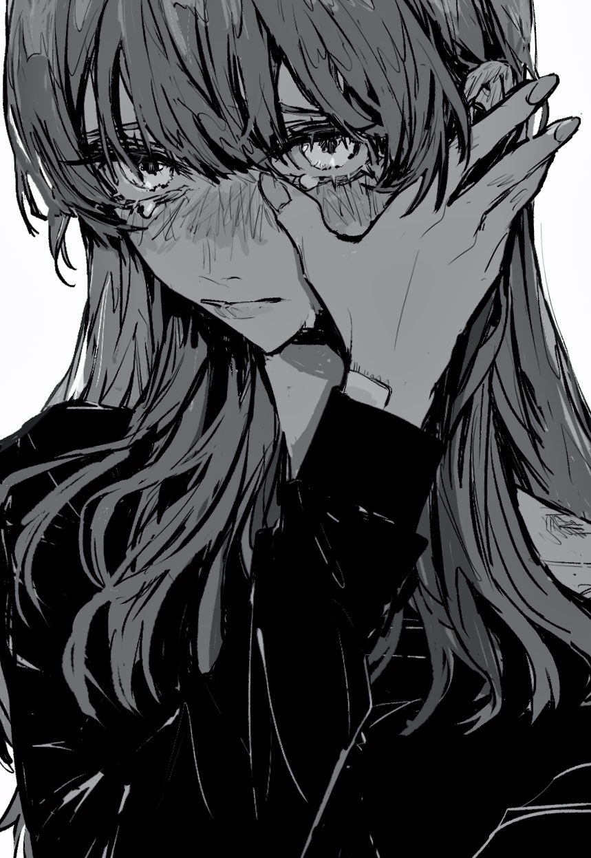 1girl blush closed_mouth fingernails greyscale hair_between_eyes hand_up highres long_hair long_sleeves looking_at_viewer monochrome original sad shirt simple_background solo tearing_up teeniika upper_body white_background