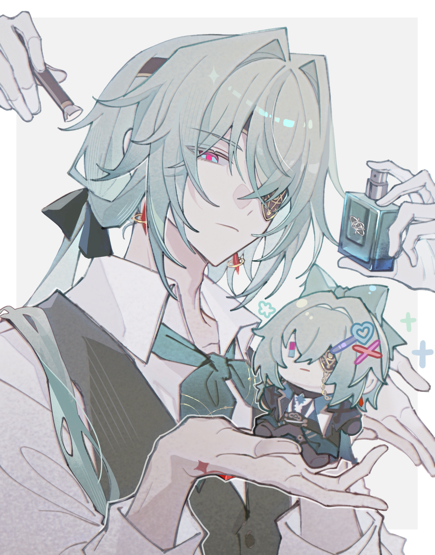 1boy anaxa_(honkai:_star_rail) anaxa_(ingenuity)_(honkai:_star_rail) apron aqua_hair black_bow blue_eyes bottle bow bowtie brown_apron character_doll chinese_commentary closed_mouth collared_shirt commentary_request doll earrings eyepatch green_bow green_bowtie hair_between_eyes hair_bow hair_intakes hair_over_one_eye hair_over_shoulder hands_up headband highres holding holding_stuffed_toy honkai:_star_rail honkai_(series) jacket jewelry long_hair long_sleeves looking_at_viewer makeup_brush male_focus missing_headwear official_alternate_costume one_eye_covered perfume_bottle shirt solo stuffed_animal stuffed_toy upper_body white_shirt yue_(shemika98425261)