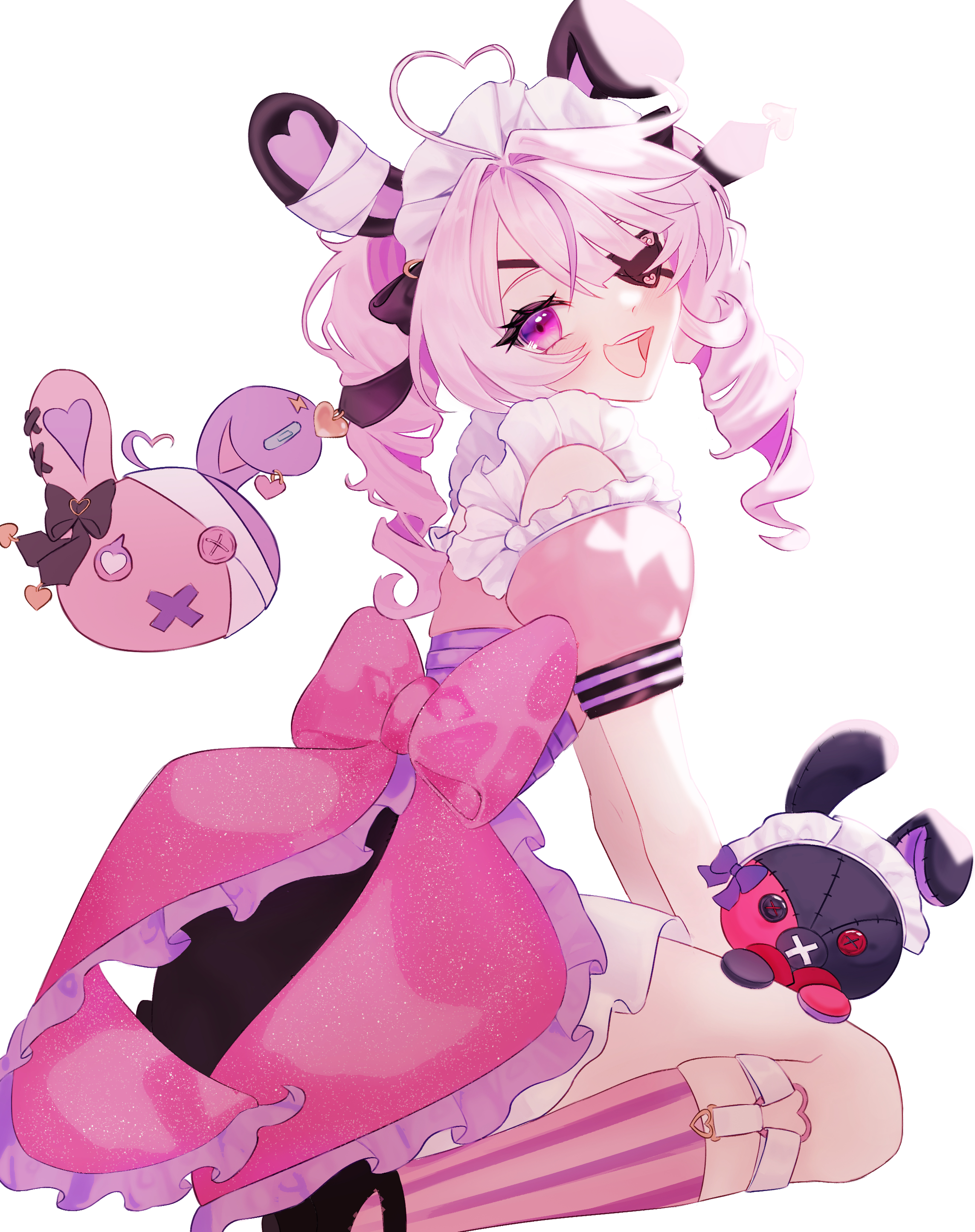 1girl :d absurdres ahoge animal_ears arms_between_legs back_bow blush bow eyepatch from_side heart heart_ahoge highres loe_190x163 looking_at_viewer maid maid_headdress maria_marionette maria_marionette_(maid) marippet_(maria_marionette) nijisanji nijisanji_en open_mouth pink_eyes pink_hair rabbit_ears simple_background sir_ventrilo_(maria_marionette) sitting smile virtual_youtuber wariza white_background