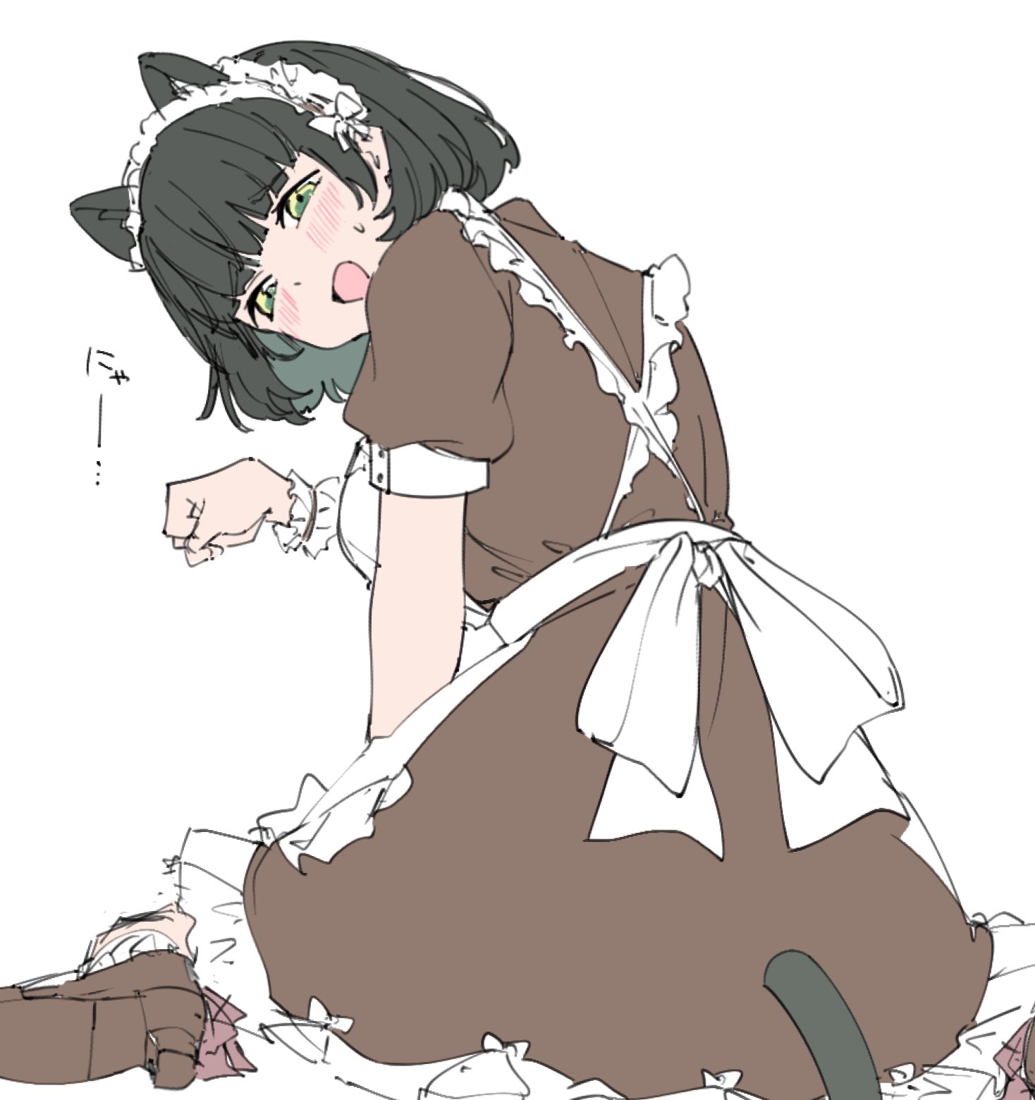 1girl :d animal_ears apron black_hair blunt_bangs bob_cut breasts brown_dress cat_ears cat_girl cat_tail commentary dress foot_out_of_frame frilled_apron frilled_dress frills green_eyes highres kemonomimi_mode large_breasts link!_like!_love_live! liz_(piyoko_piyop) looking_at_viewer love_live! maid_apron medium_dress momose_ginko nyan_nyan_nyan_fair_in_gamers official_alternate_costume open_mouth paw_pose puffy_short_sleeves puffy_sleeves short_hair short_sleeves simple_background sitting sketch smile solo sweatdrop untranslatable_commentary tail virtual_youtuber wariza white_apron white_background