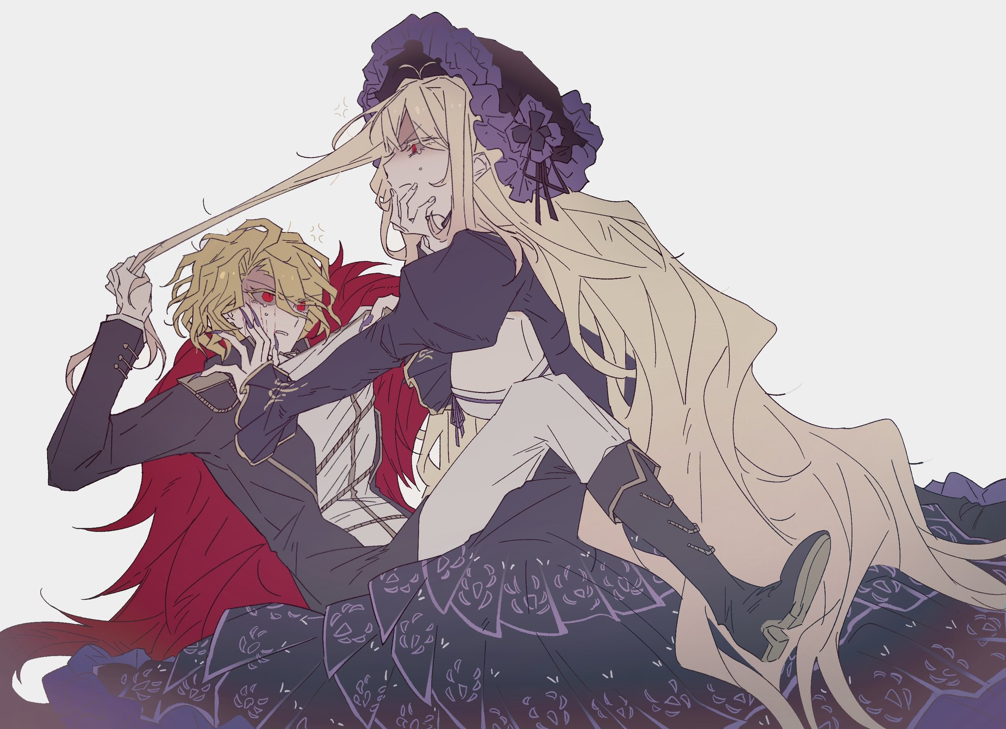 2girls black_boots black_coat black_ribbon blonde_hair boots coat don_quixote_(project_moon) dress dulcinea_(project_moon) gold_trim grabbing_another's_hair hat highres holding_another's_hair jacket juliet_sleeves limbus_company long_hair long_sleeves multiple_girls open_mouth pants parted_bangs project_moon puffy_sleeves purple_dress purple_hat red_eyes ribbon sancho_(project_moon) short_hair simple_background v9sk51z6jxquzom very_long_hair white_background white_jacket white_pants