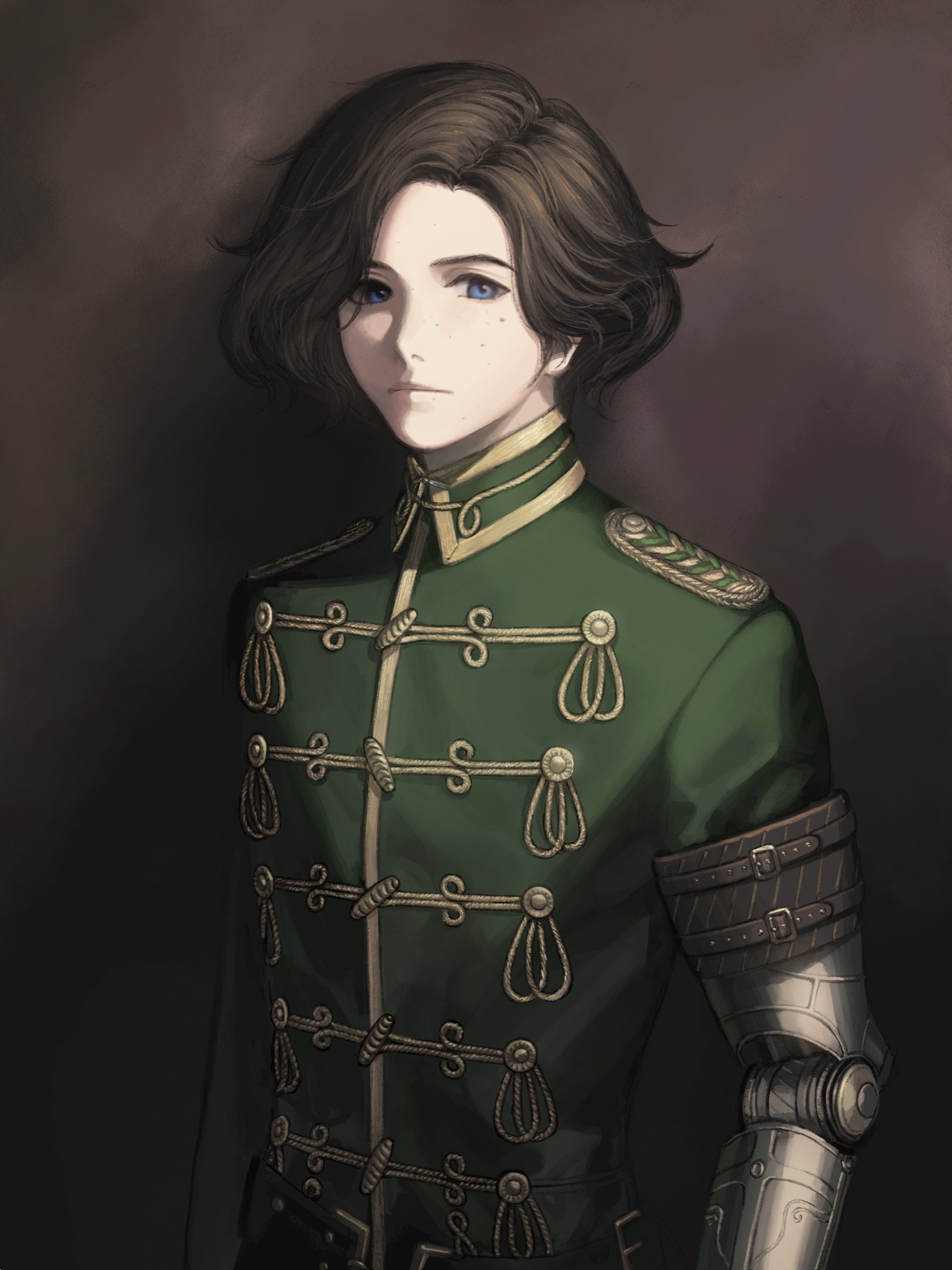 1boy black_hair blue_eyes brown_background coat commentary english_commentary freckles green_coat highres lies_of_p male_focus mechanical_arms mik_blamike pinocchio_(lies_of_p) prosthesis prosthetic_arm single_mechanical_arm solo