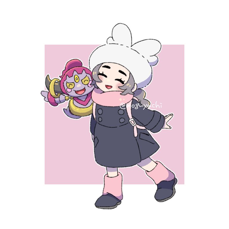 1girl ansha_(pokemon) black_coat black_shoes blush closed_eyes coat eyelashes full_body gen_6_pokemon grey_hair hachisen hat hoopa hoopa_(confined) legendary_pokemon long_hair long_sleeves mythical_pokemon nintendo open_mouth pokemon pokemon_(creature) pokemon_legends:_z-a shoes twitter_username white_hat