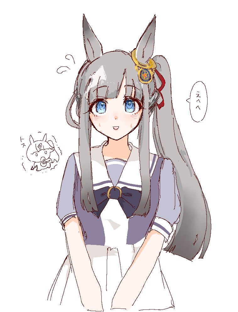 1girl alternate_hairstyle animal_ears blue_eyes blush breasts chrono_genesis_(umamusume) collarbone commentary_request horse_ears horse_tail looking_at_viewer okinaman open_mouth school_uniform simple_background small_breasts solo tail tracen_school_uniform translation_request umamusume white_background