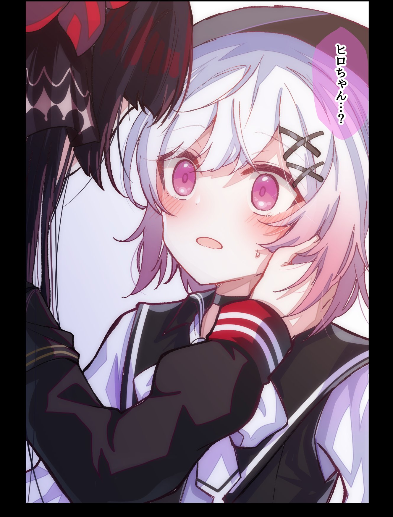 2girls beret black_border black_choker black_hair black_hat blush border choker commentary_request flower hair_flower hair_ornament hand_on_another's_cheek hand_on_another's_face hat highres huleito long_hair long_sleeves mahou_shoujo_no_majo_saiban multicolored_hair multiple_girls nikaido_hiro open_mouth out_of_frame pink_eyes pink_hair sakuraba_ema short_hair speech_bubble surprised translation_request upper_body white_hair wide-eyed x_hair_ornament