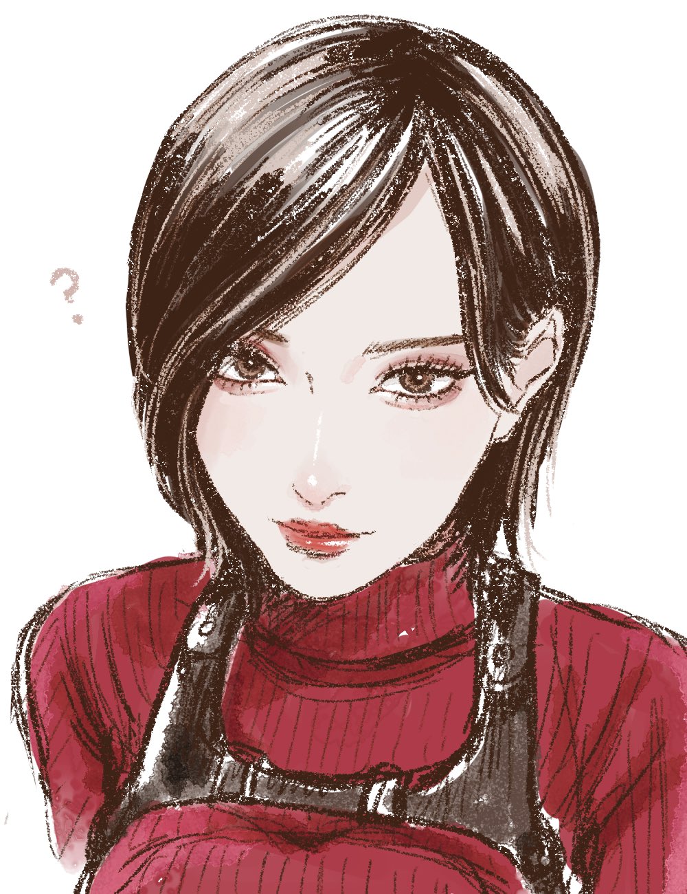 1girl ? ada_wong aegyo_sal asian balcony breasts brown_eyes commentary hashtag-only_commentary highres illust2222 large_breasts lips portrait red_lips red_sweater resident_evil resident_evil_4 resident_evil_4_(remake) ribbed_sweater short_hair smile solo sweater turtleneck turtleneck_sweater