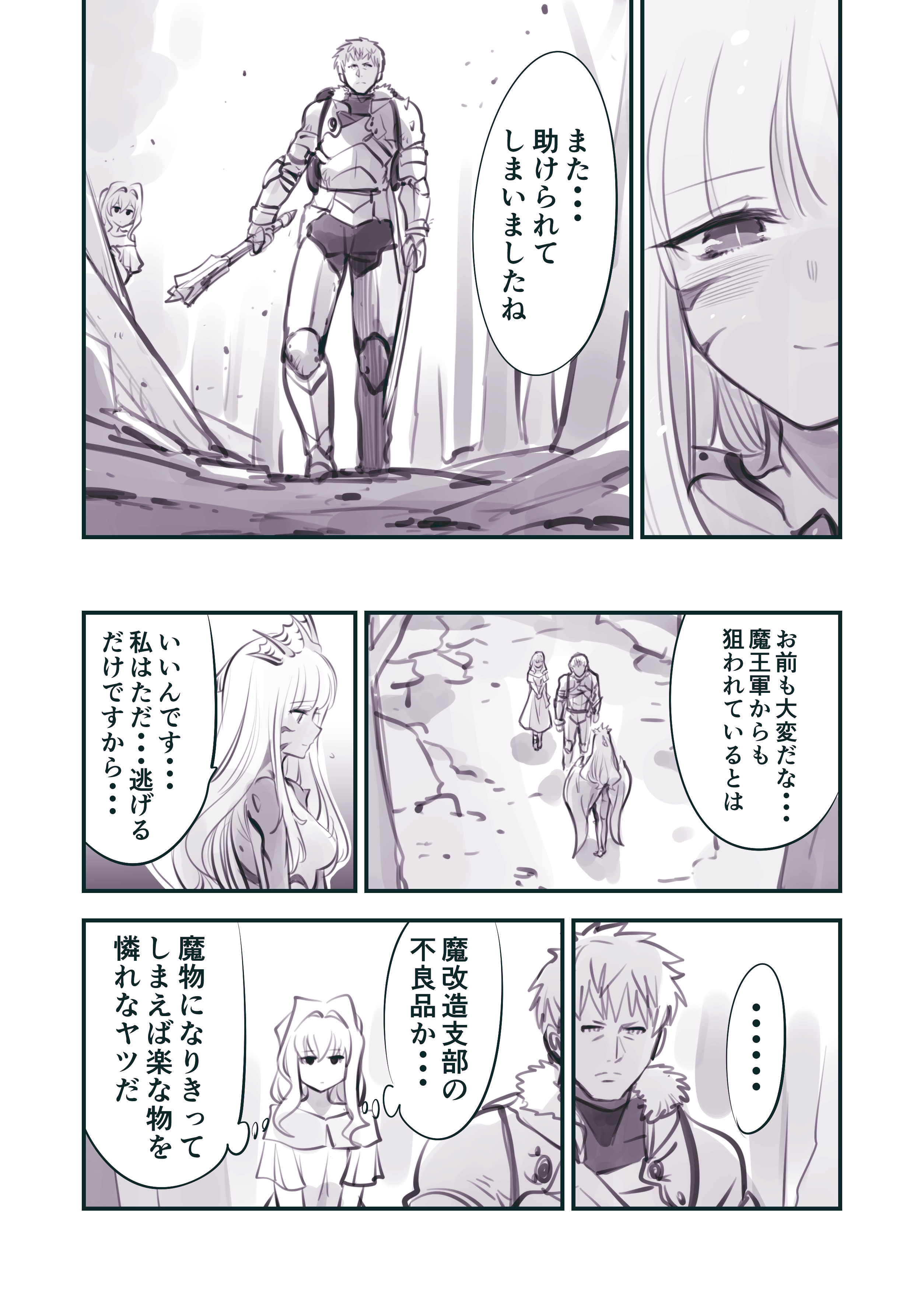 1boy 2girls absurdres cave_interior devil's_hand_(ishiyumi) highres kato_takuji long_hair ma_no_mono-tachi mace monster_girl multiple_girls princess_(ishiyumi) speech_bubble sword weapon