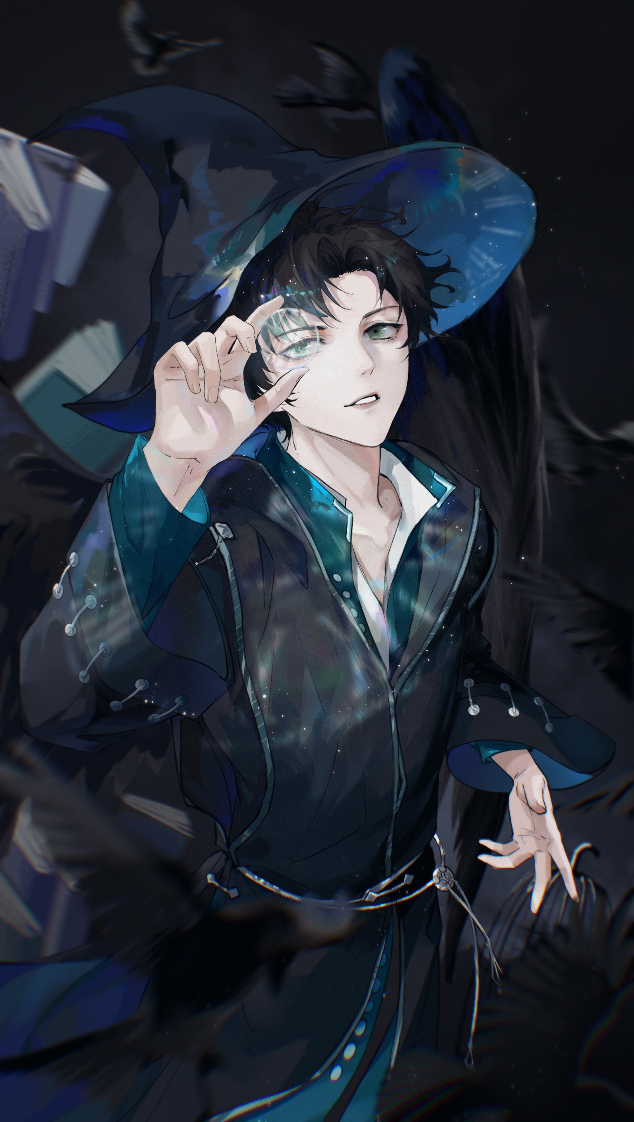 1boy absurdres amon_(lord_of_the_mysteries) bird black_background black_bird black_feathers black_hair black_hat black_robe blurry blurry_foreground book chinese_commentary crow feathers glass_shard green_eyes hand_up hat highres holding_glass_shard light_particles long_sleeves looking_at_viewer lord_of_the_mysteries magic male_focus nidexintu parted_lips robe short_hair smile solo standing wide_sleeves witch_hat