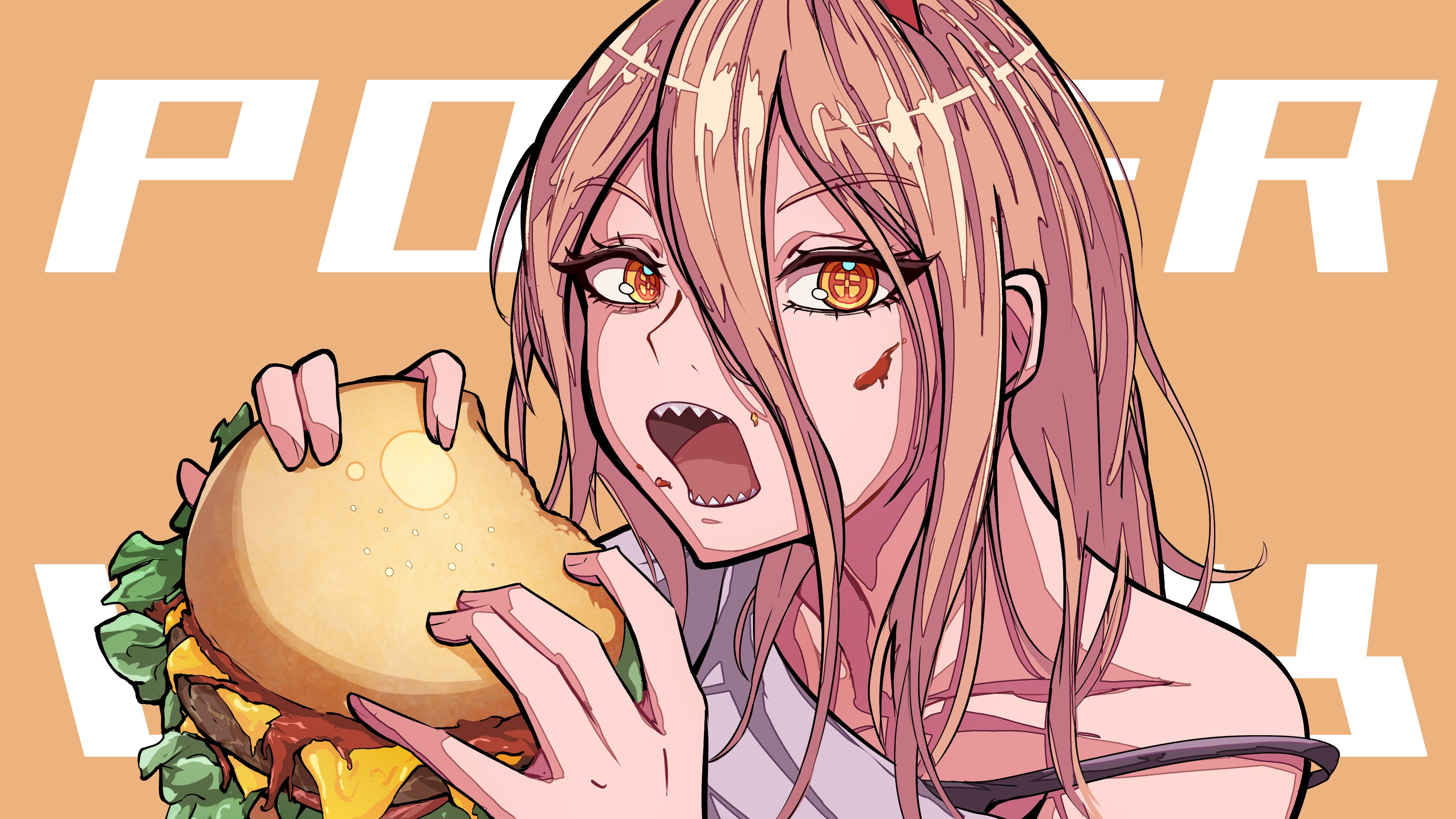 1girl absurdres blonde_hair bra_strap burger chainsaw_man character_name commentary_request crosshair_pupils double-parted_bangs eating food food_on_face grey_shirt hair_between_eyes highres holding holding_burger holding_food karan_koron100 long_hair long_hair_between_eyes looking_at_viewer open_mouth power_(chainsaw_man) sharp_teeth shirt solo strap_slip teeth upper_body yellow_background yellow_eyes