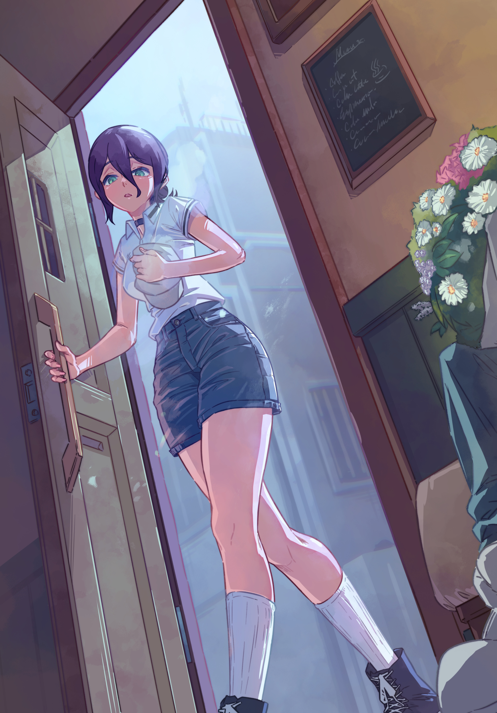 1boy 1girl absurdres black_choker blue_eyes blue_shorts bouquet chainsaw_man choker denji_(chainsaw_man) door flower hair_between_eyes hat highres holding holding_unworn_clothes holding_unworn_hat opening_door overcast polo_shirt purple_hair reze_(chainsaw_man) shirt shorts sky slothdev_(yat1215) socks solo_focus unworn_hat unworn_headwear white_flower white_shirt white_socks