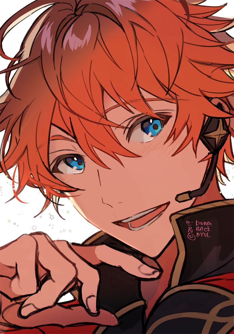 1boy akehoshi_subaru blue_eyes commentary dongbackbyul ensemble_stars! hair_between_eyes hand_up looking_to_the_side male_focus microphone open_mouth orange_hair portrait short_hair simple_background smile solo white_background