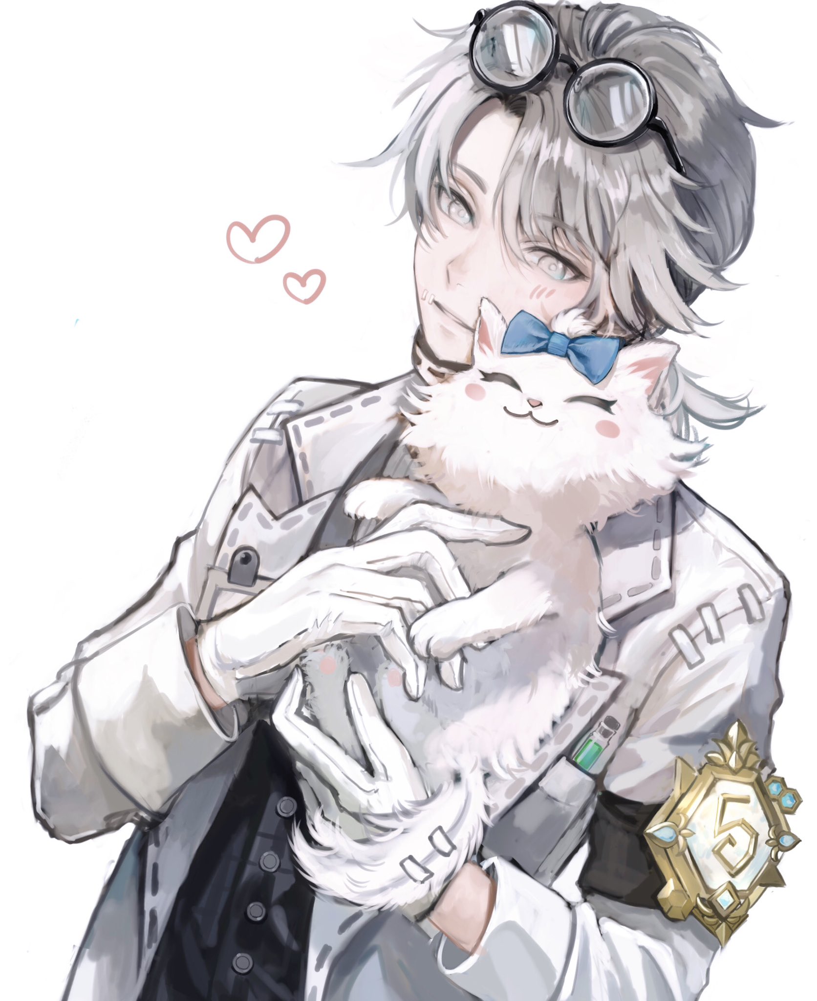 1boy aesop_carl aesop_carl_(gatto) animal armband black_armband black_shirt blue_bow blush_stickers bow cat eyewear_on_head glasses gloves grey_eyes grey_hair hanaochi_pic heart highres holding holding_animal holding_cat identity_v jacket looking_at_another low_ponytail male_focus official_alternate_costume ponytail round_eyewear shirt short_ponytail solo striped_blush upper_body white_cat white_gloves white_jacket