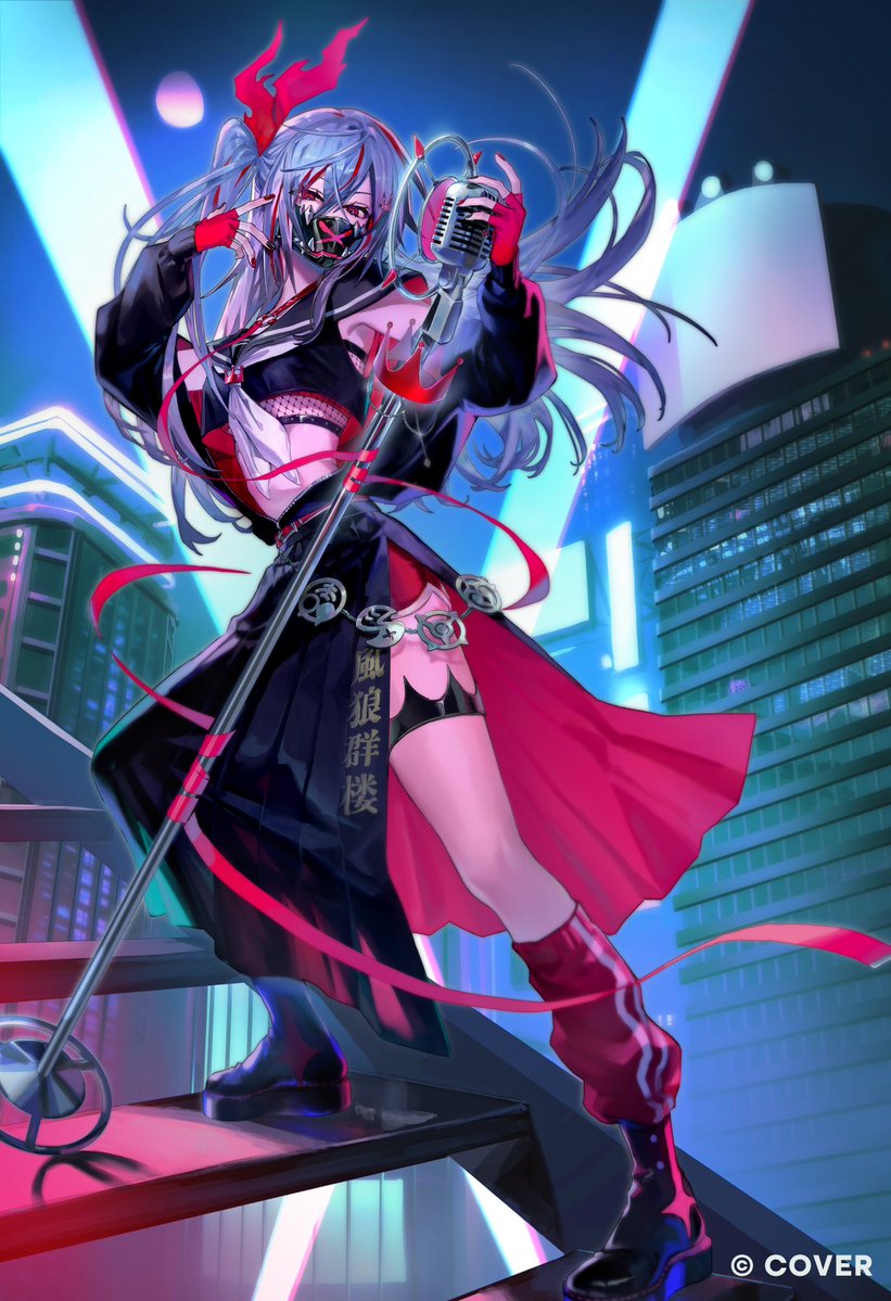 0083_ztzt 1girl alternate_costume black_boots black_jacket black_mask black_nails black_sailor_collar black_serafuku black_shirt black_skirt boots breasts commentary_request copyright_name cropped_shirt double-parted_bangs fishnet_top fishnets full_body gloves grey_hair hair_between_eyes hands_up holding holding_microphone hololive hololive_dev_is isaki_riona jacket kneehighs long_hair long_skirt looking_at_viewer loose_socks mask microphone microphone_stand midriff moon mouth_mask multicolored_hair nail_polish navel neckerchief night off_shoulder official_art one_side_up outdoors partially_unzipped pleated_skirt red_eyes red_gloves red_hair red_nails red_shorts red_socks sailor_collar school_uniform serafuku shirt short_shorts shorts shorts_under_skirt side_slit skirt sky small_breasts socks solo stairs streaked_hair virtual_youtuber white_neckerchief