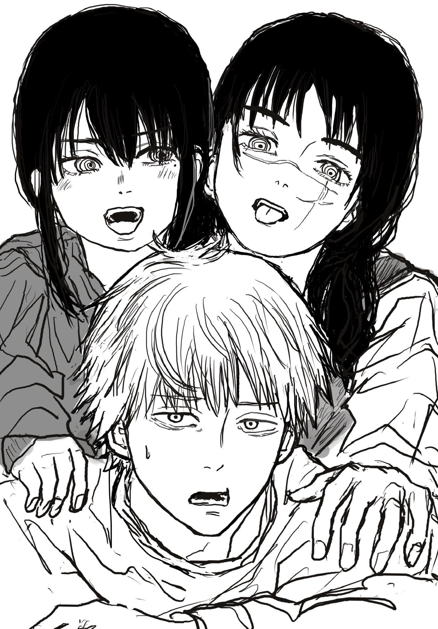 1boy 2girls chainsaw_man denji_(chainsaw_man) greyscale hand_on_another's_shoulder highres long_hair monochrome multiple_girls nayuta_(chainsaw_man) open_mouth ringed_eyes shirt short_hair sidelocks sky8bow tongue tongue_out yoru_(chainsaw_man)
