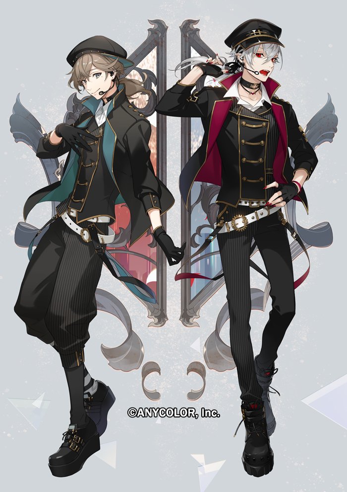 2boys ankle_boots aqua_jacket arm_at_side backwards_hat belt black_boots black_choker black_gloves black_hat black_jacket black_pants black_ribbon black_shoes black_socks black_vest boots brown_hair buttons capri_pants choker closed_mouth collarbone collared_shirt copyright_notice cross cross_choker double-breasted double-parted_bangs ear_piercing earrings fingerless_gloves fingernails full_body gloves grey_background grey_eyes hair_between_eyes hair_ribbon hand_on_own_chest hand_on_own_hip hand_up hat headset iwamoto_zerogo jacket jewelry kanae_(7th_costume)_(nijisanji) kanae_(nijisanji) kuzuha_(3rd_costume)_(nijisanji) kuzuha_(nijisanji) lace-up_boots long_hair long_sleeves looking_at_viewer low_ponytail male_focus matching_outfits medium_hair mole mole_under_eye multiple_belts multiple_boys nijisanji official_alternate_costume official_art open_clothes open_jacket open_mouth pants peaked_cap piercing pinstripe_pants pinstripe_pattern platform_shoes pointy_ears ponytail red_eyes red_jacket red_nails ribbon sharp_fingernails shirt shoes side-by-side sideways_glance smile socks standing two-sided_fabric two-sided_jacket vest virtual_youtuber white_belt white_hair white_shirt wing_collar