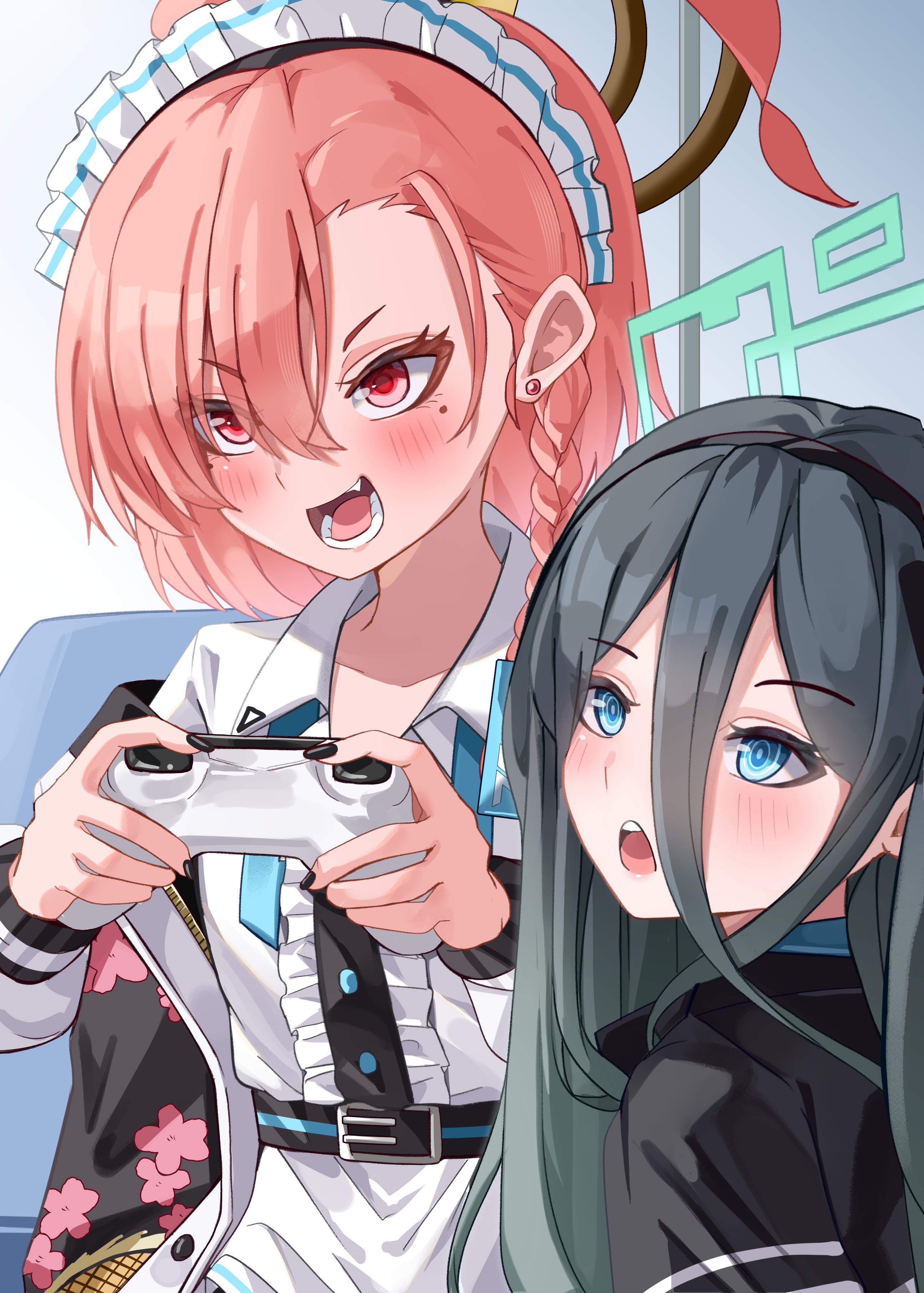 2girls :d absurdres ahoge aris_(blue_archive) black_hair black_nails blue_archive blue_eyes blush braid brown_halo center_frills collared_shirt commentary_request controller double-parted_bangs earrings eyelashes eyes_visible_through_hair fang frilled_shirt frills game_controller green_halo hair_between_eyes halo hands_up highres holding holding_controller holding_game_controller huge_ahoge id_card indoors jewelry long_hair long_hair_between_eyes looking_ahead mahoro_(minase_mahoro) maid maid_headdress mole mole_under_each_eye mole_under_eye multiple_girls multiple_moles nail_polish neru_(blue_archive) open_mouth orange_hair playing_games playing_video_games rectangular_halo red_eyes ringed_eyes shirt short_hair single_braid smile smirk straight_hair stud_earrings teeth tongue tsurime upper_body upper_teeth_only v-shaped_eyebrows white_shirt