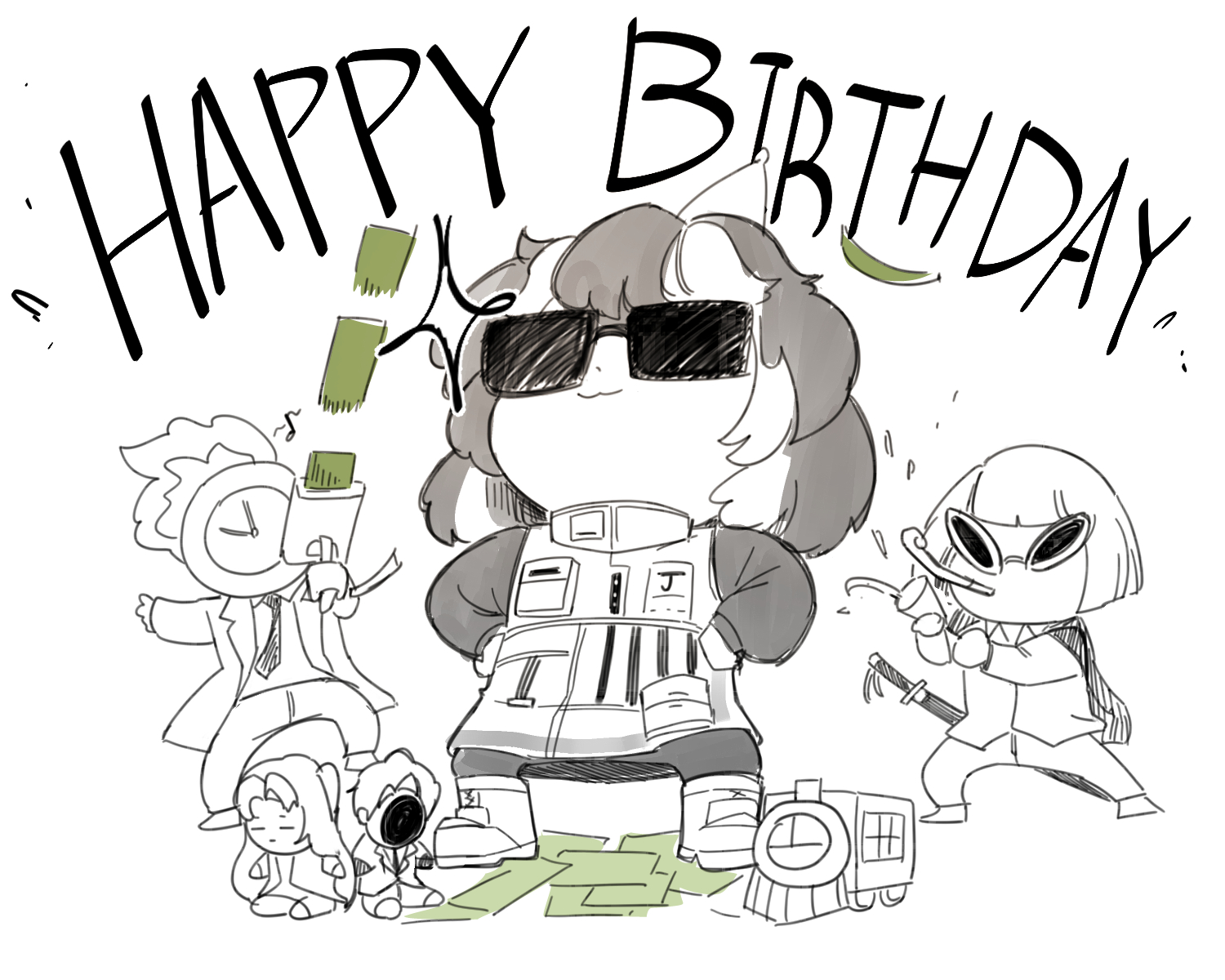 1boy 2girls 2others angela_(project_moon) black_mask black_pants bob_cut coat collared_shirt commentary_request dante_(limbus_company) exadcr95 happy_birthday highres jacket korean_commentary library_of_ruina limbus_company lobotomy_corporation long_hair mask medium_hair mephistopheles_(project_moon) money monochrome multiple_girls multiple_others necktie ootachi pants project_moon roland_(project_moon) ryoshu_(project_moon) schna_jang shirt shoes short_hair simple_background spot_color sunglasses white_background white_jacket