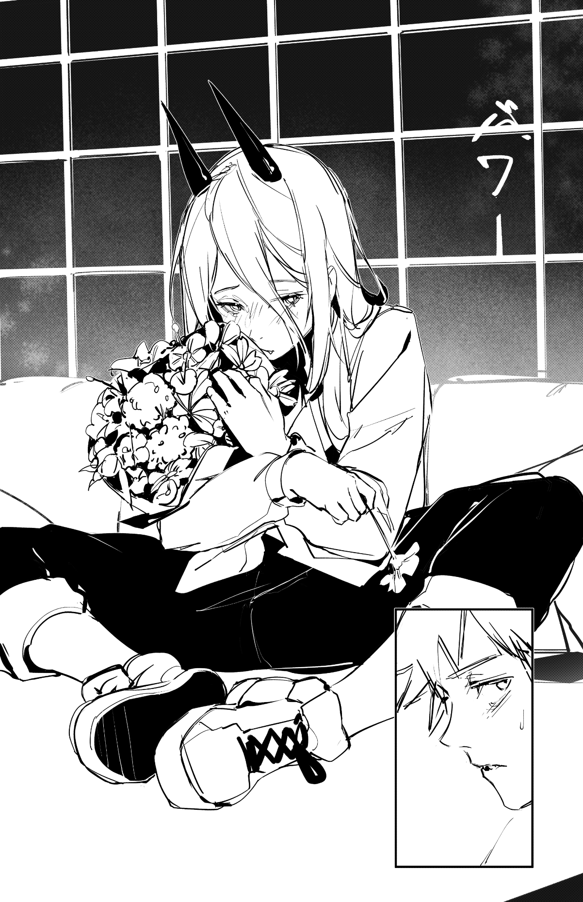 1boy 1girl bouquet chainsaw_man demon_girl demon_horns denji_(chainsaw_man) flower greyscale hair_between_eyes highres holding holding_bouquet horns kuno_(runkunochan) long_hair long_hair_between_eyes monochrome pants power_(chainsaw_man) red_horns shirt shoes sitting spread_legs sweatdrop window