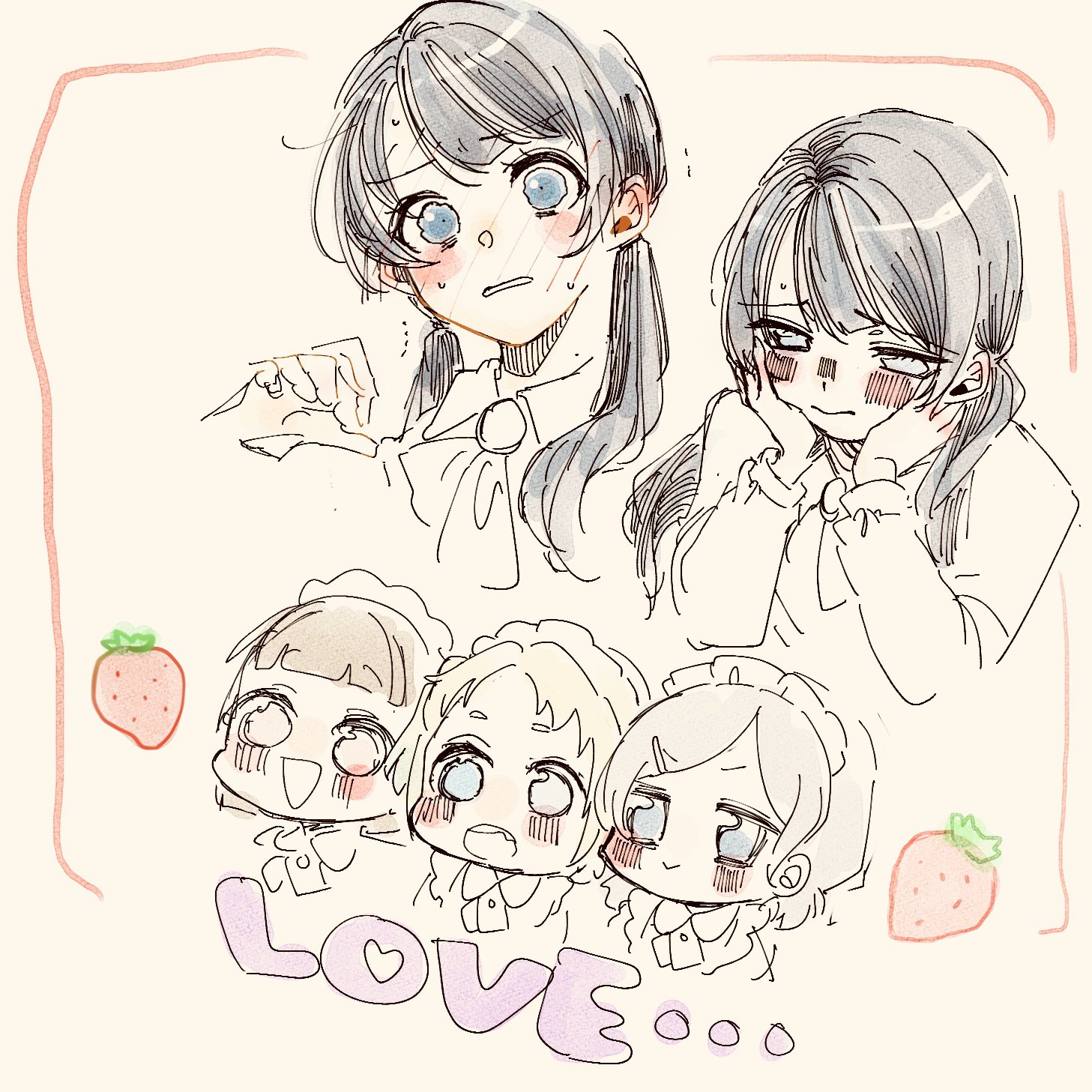 4girls blonde_hair blue_eyes blush brown_hair center-flap_bangs ceras_yanagida_lilienfeld cho_toutoi_love~ collared_shirt commentary_request embarrassed food fruit grey_hair hands_on_own_cheeks hands_on_own_face highres ichigo_123_(love_live!) kachimachi_kosuzu link!_like!_love_live! love_live! maid maid_headdress multiple_girls murano_sayaka muted_color nose_blush official_alternate_costume open_mouth osawa_rurino parted_lips raised_inner_eyebrows ruri&to_(love_live!) shin_(shnnnnrn1) shirt simple_background strawberry virtual_youtuber white_background